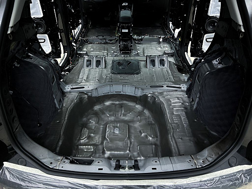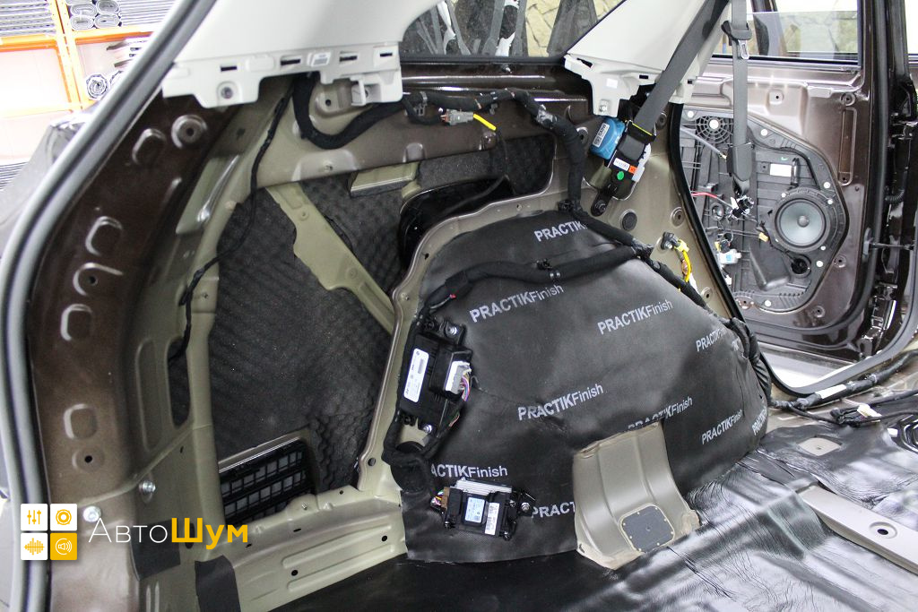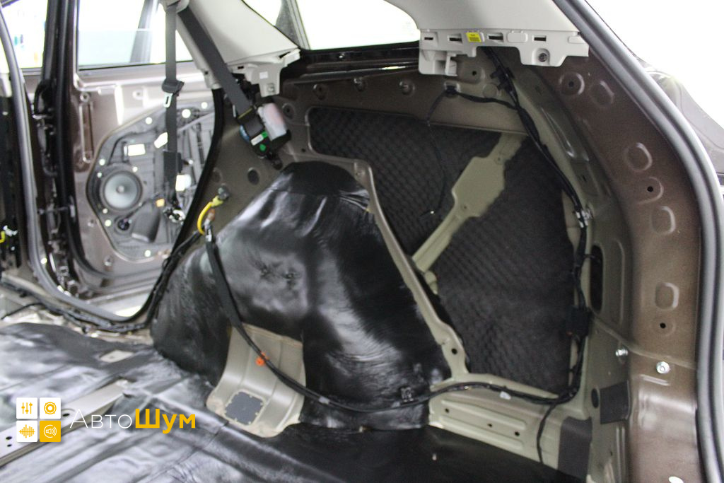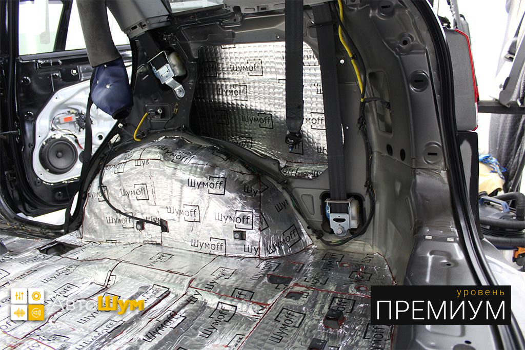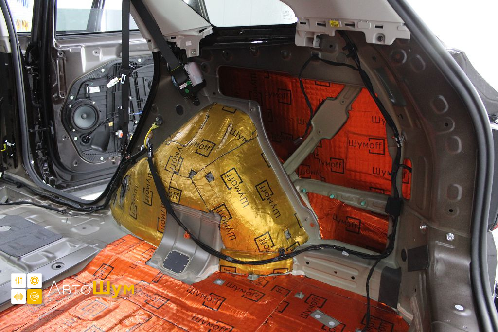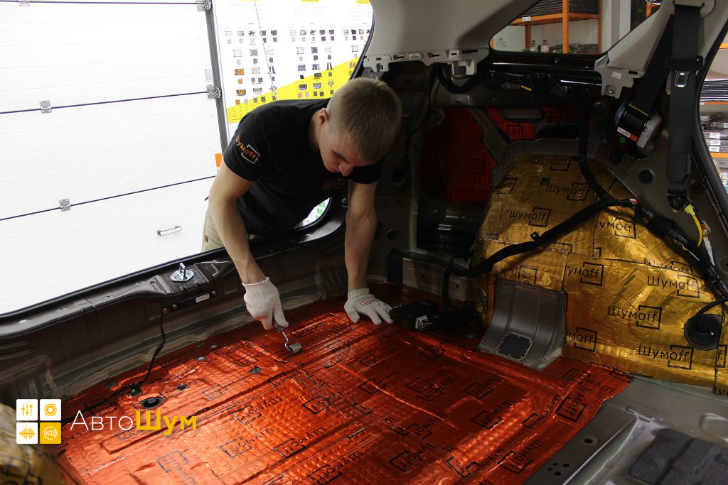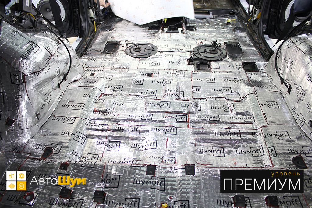 Дно багажника и крылья оклеиваются шумо и теплоизолятором Шумофф П4 4. Арки оклеиваются шумопоглотителем Flex A15.