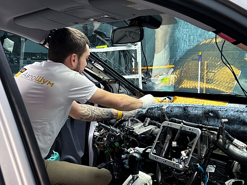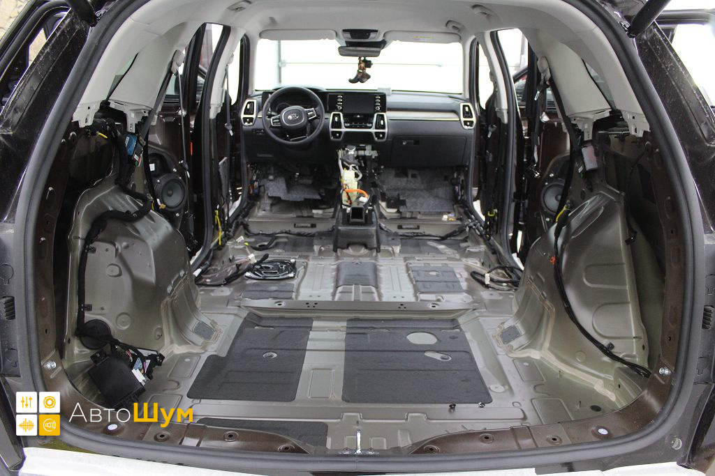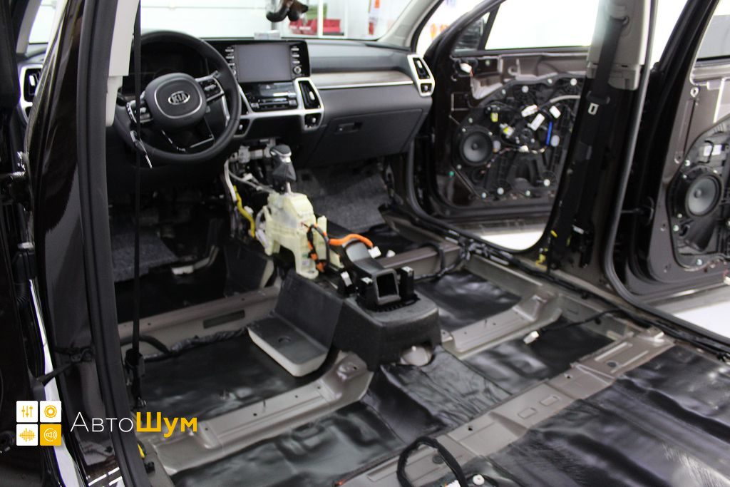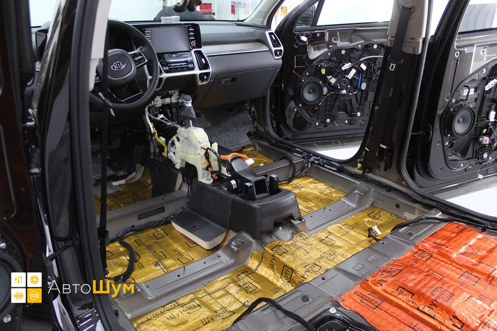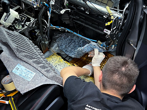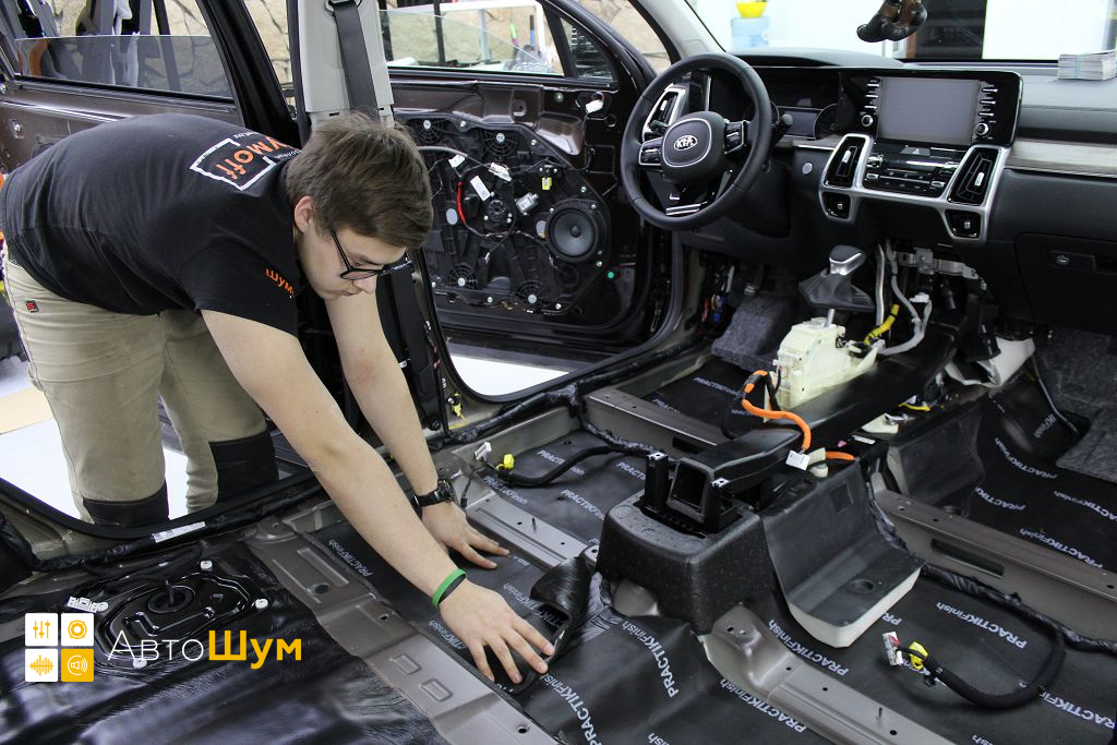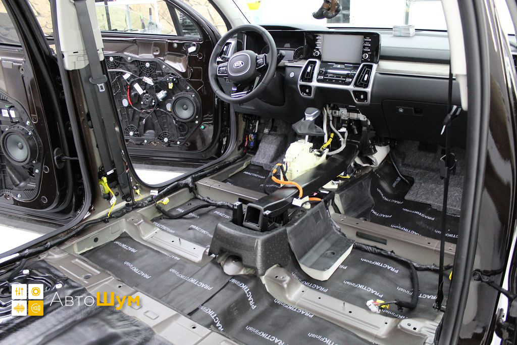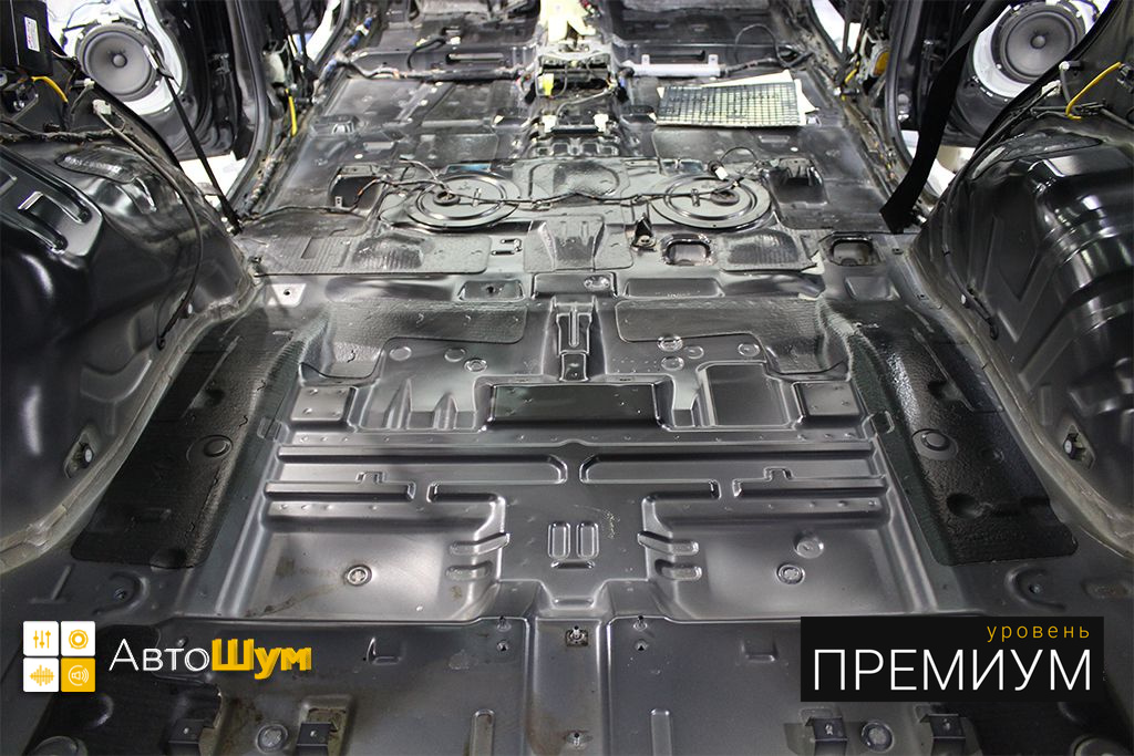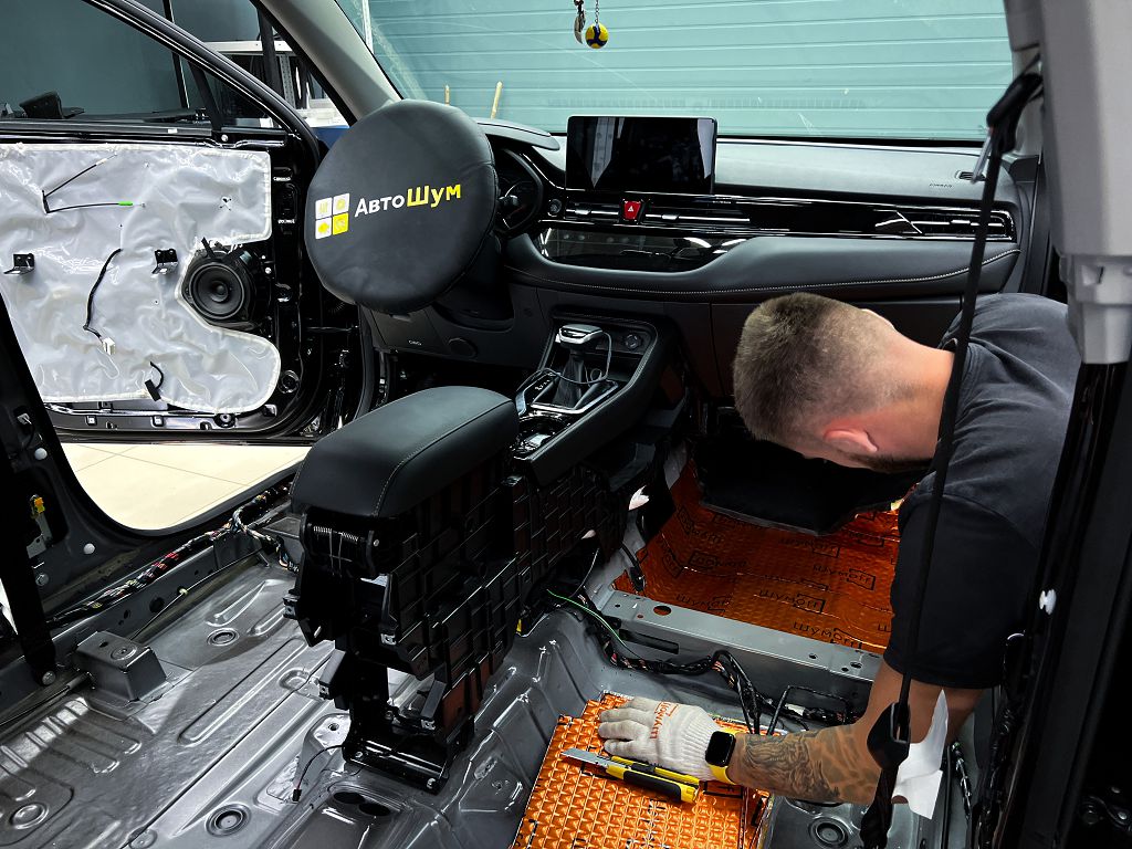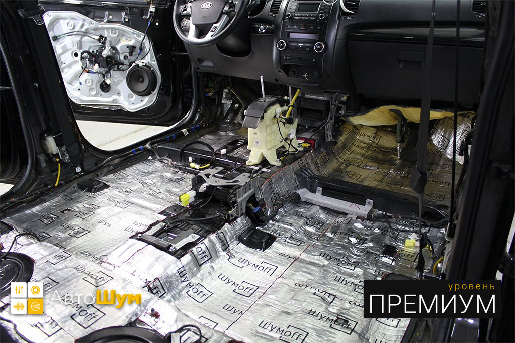 От моторной перегородки и до заднего сиденья вмести с ним клеится мощный многослойный шумо и звукоизолятор Шумофф Prizma 6.