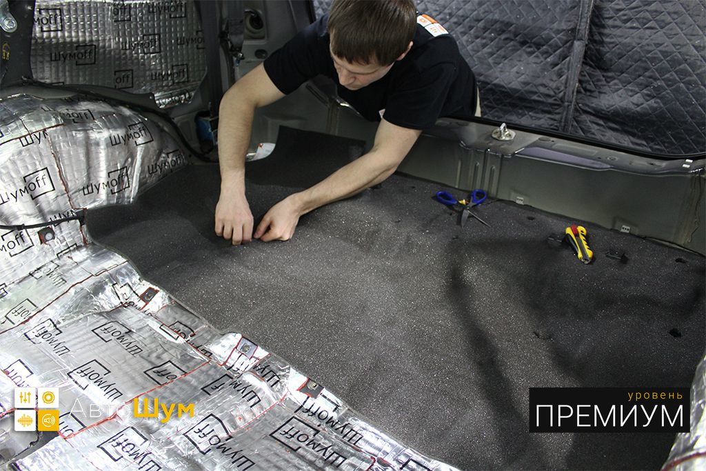 Обезжириваем поверхность и приступаем к монтажу второго слоя. Также для получения более эффективного результата используем компоновку из двух материалов На дно багажника клеим Шумофф Base 4. Этот слой позволит снизить нам шум от дороги.