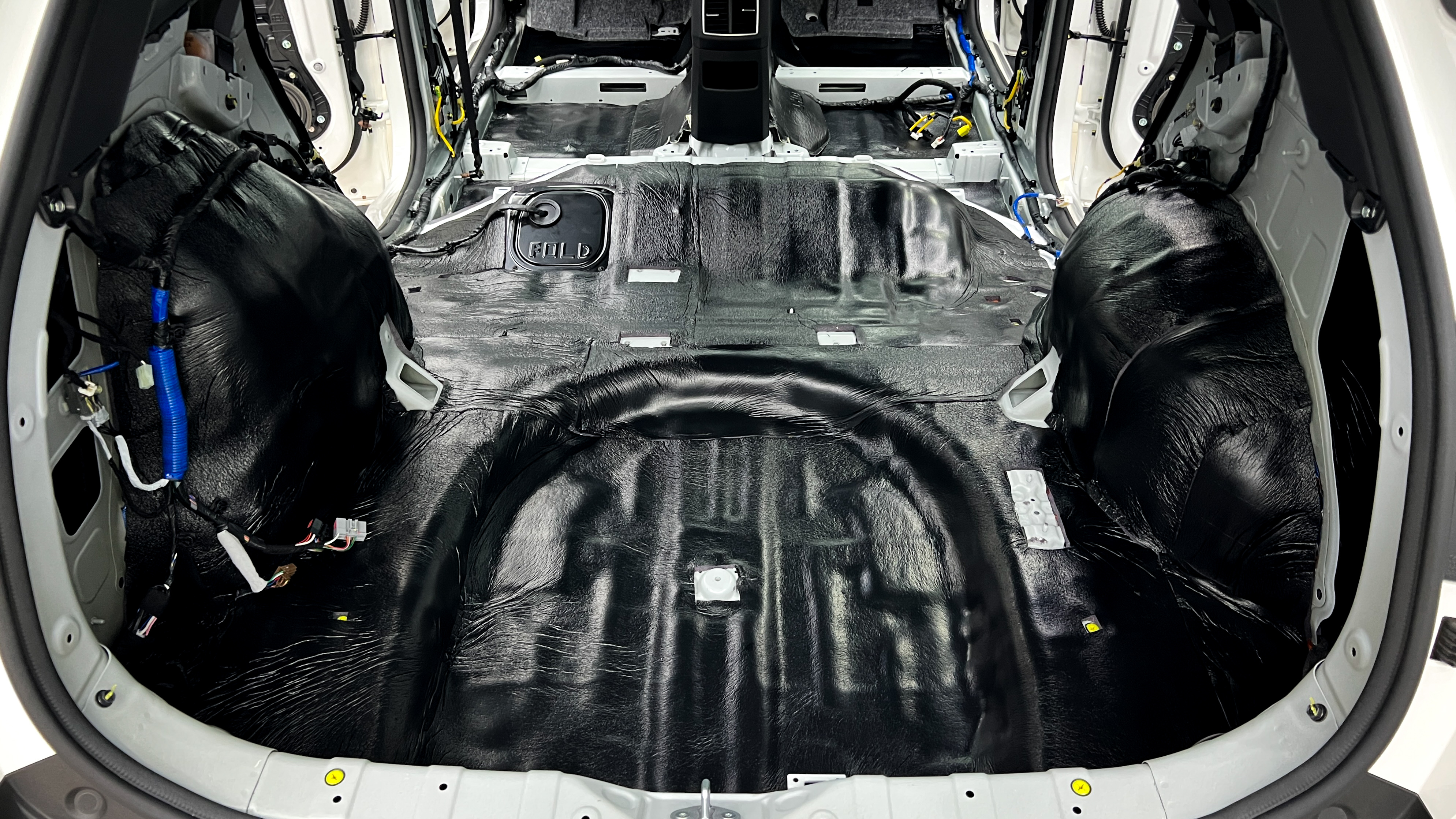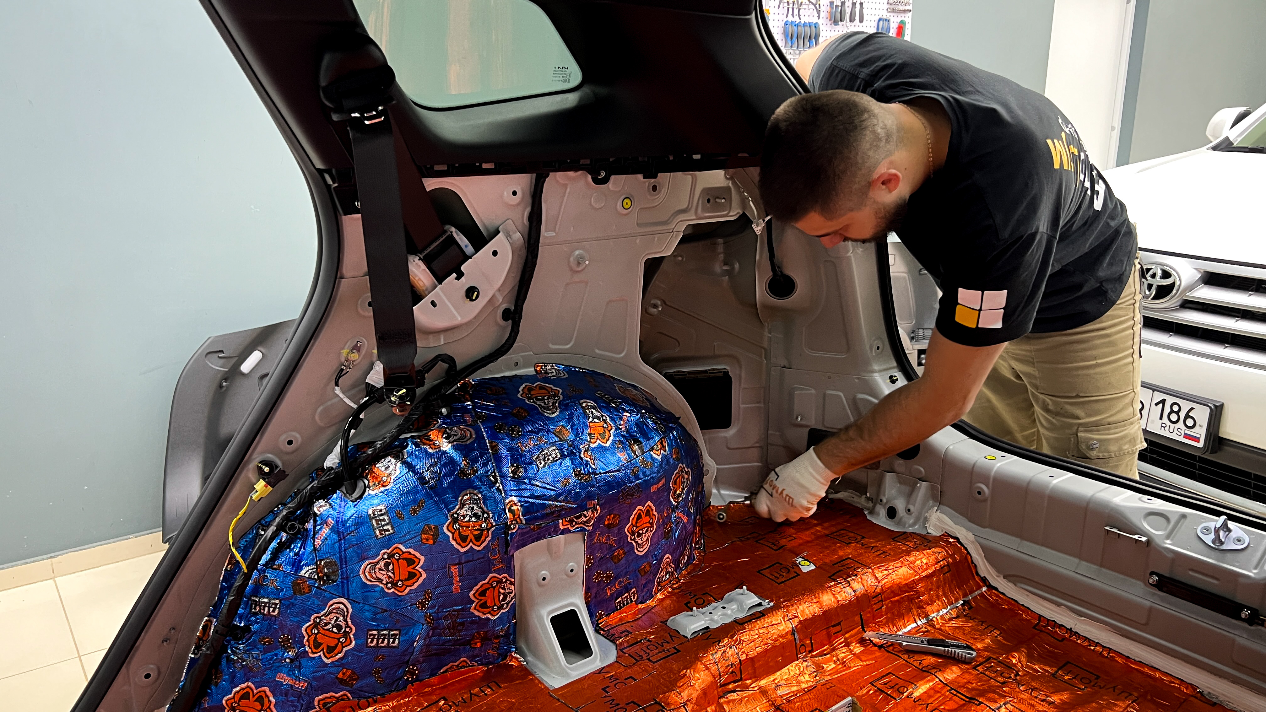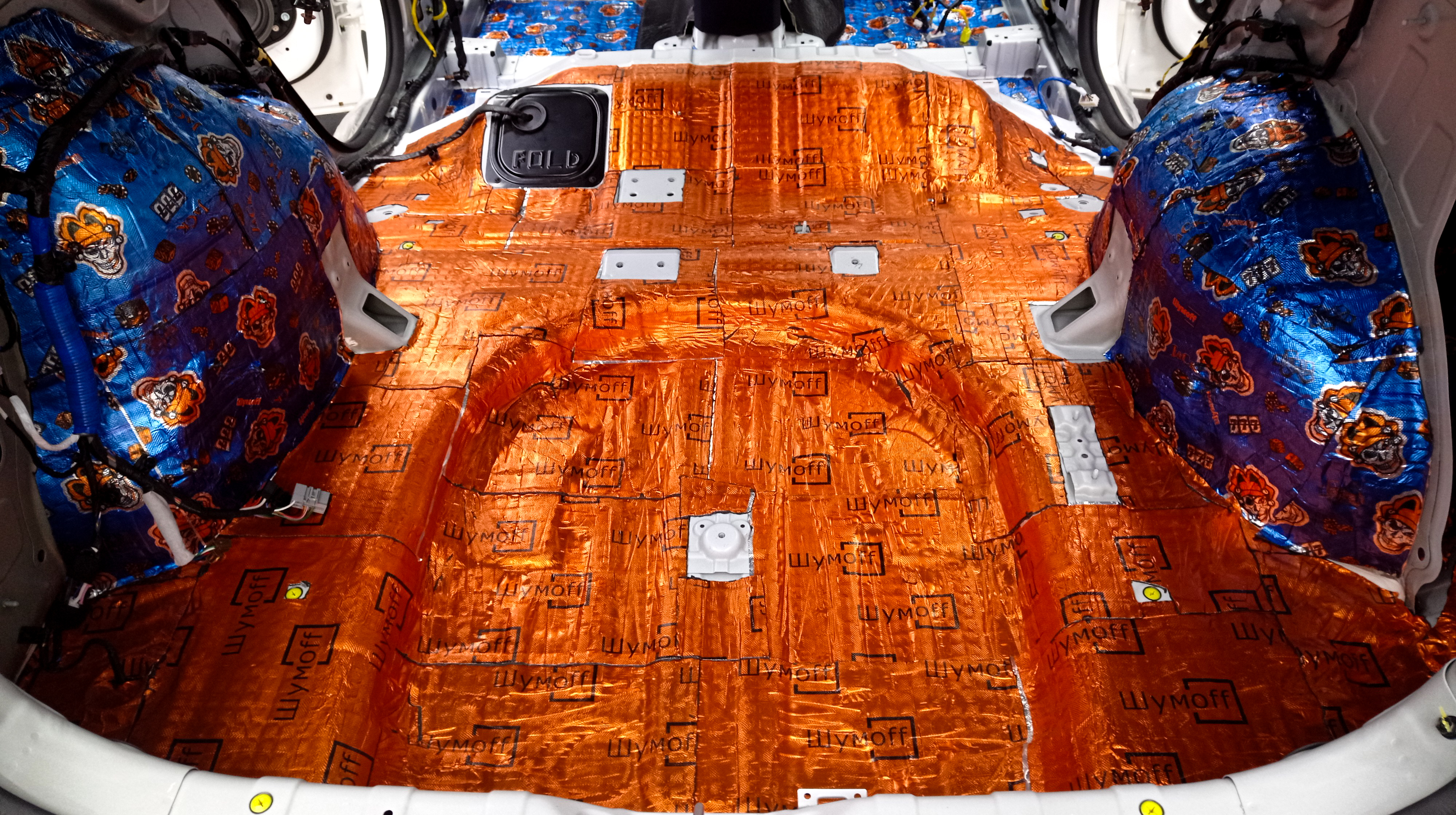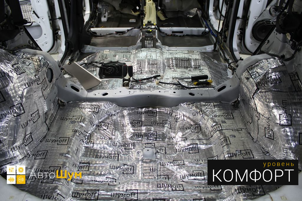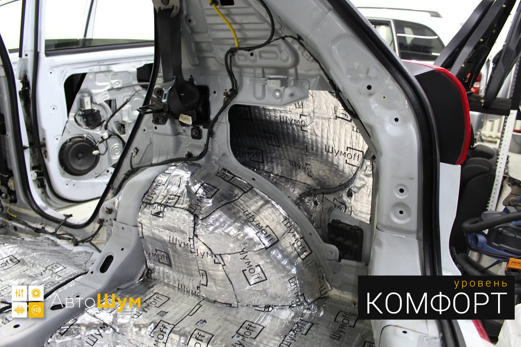 Дно багажника и крылья оклеиваются шумо и теплоизолятором Шумофф П4 4. Арки оклеиваются шумопоглотителем Flex A15.