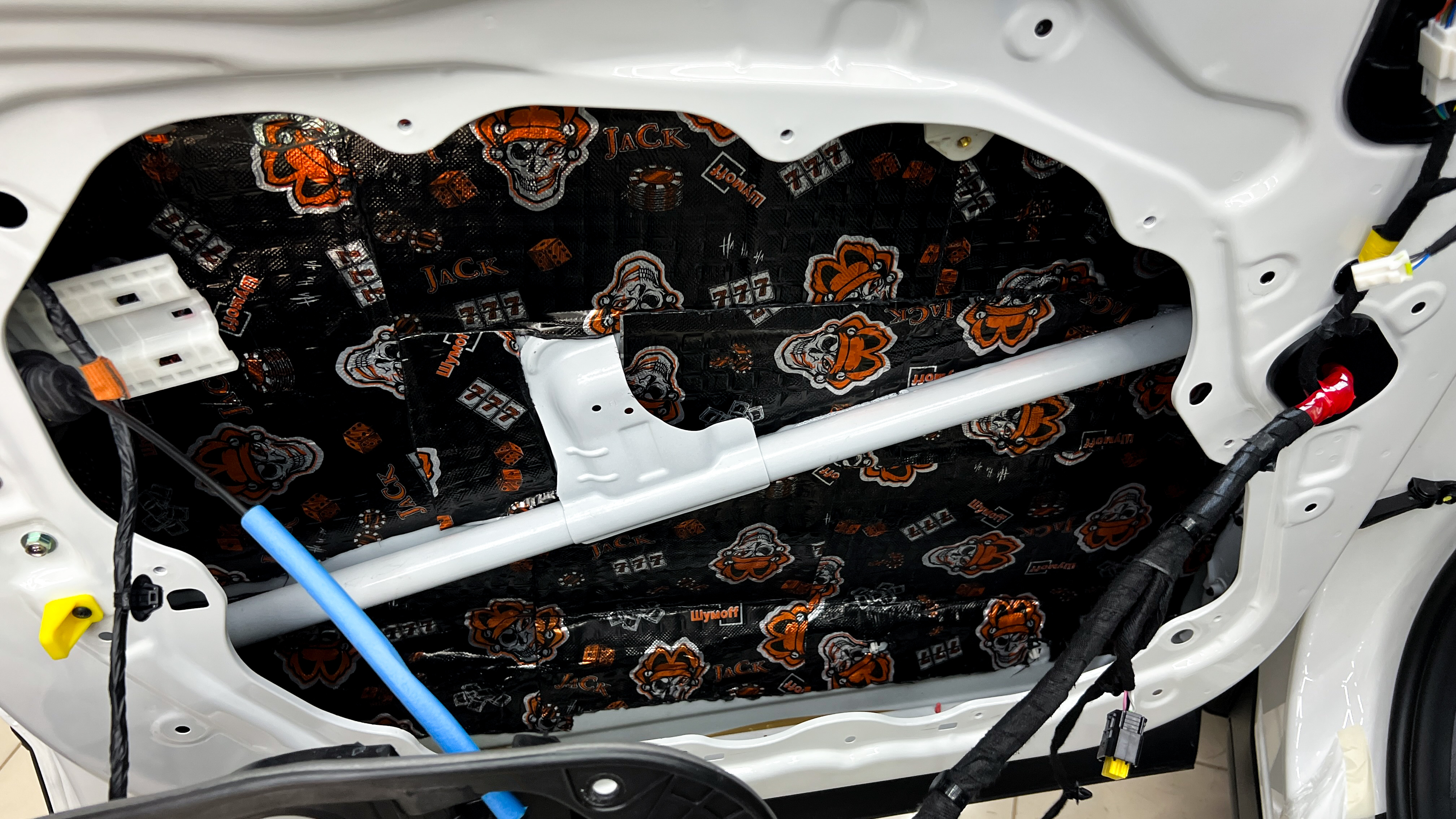 Переходим к оклейке самого корпуса панели, первым слоем частично наносим виброизоляцию Шумофф Joker, создавая тем самым идеальный баланс. Такая частичная оклейка позволит нам чрезмерно не утяжелять панель и придать ей необходимую сбитость