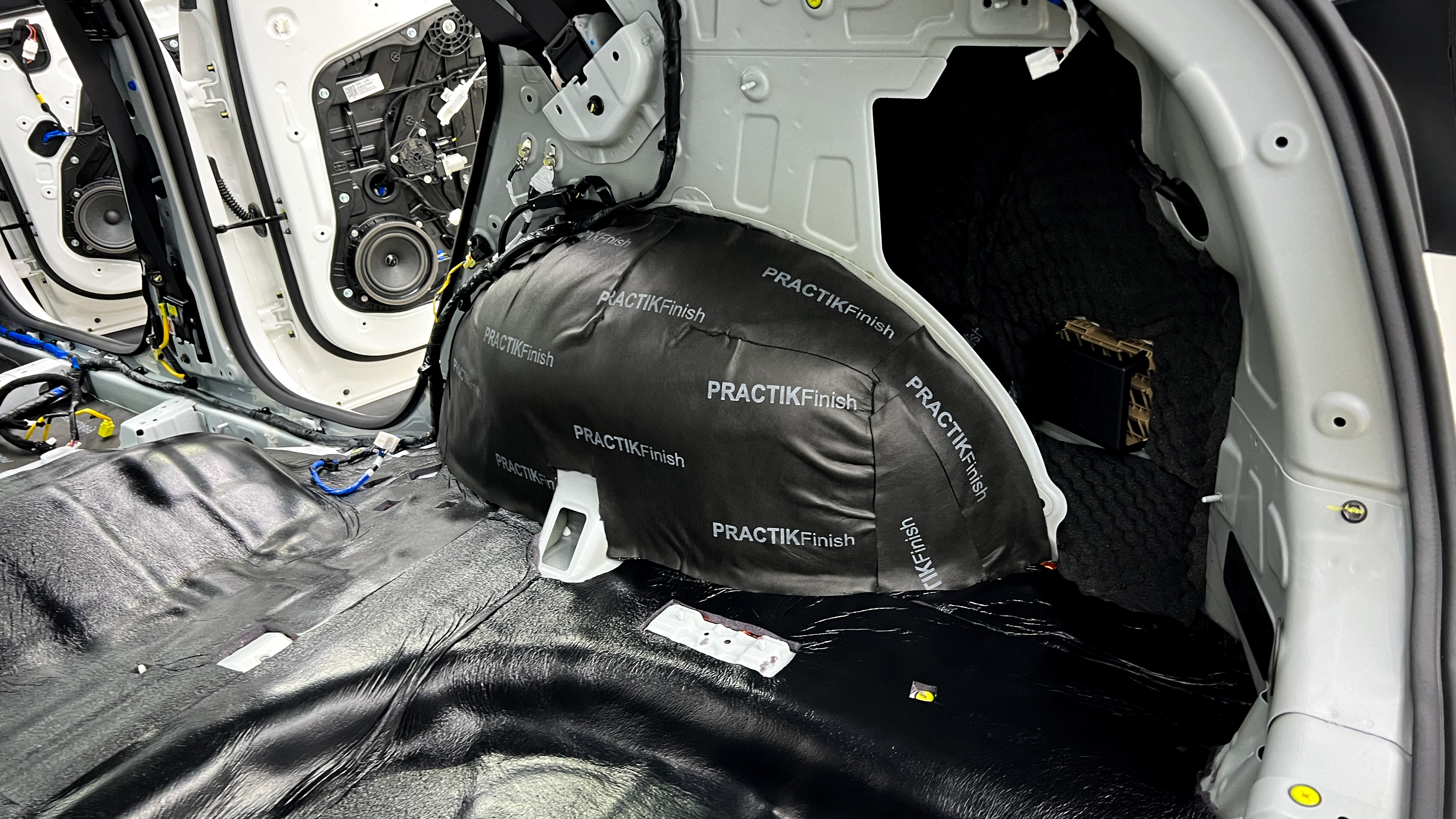 Завершаем шумоизоляцию нанесением третьего слоя звукоизоляционной мембраны Practik Finish на арки. В результате получаем компоновку материалов с максимальной эффективностью и возможностью сборки салона в первозданный вид.