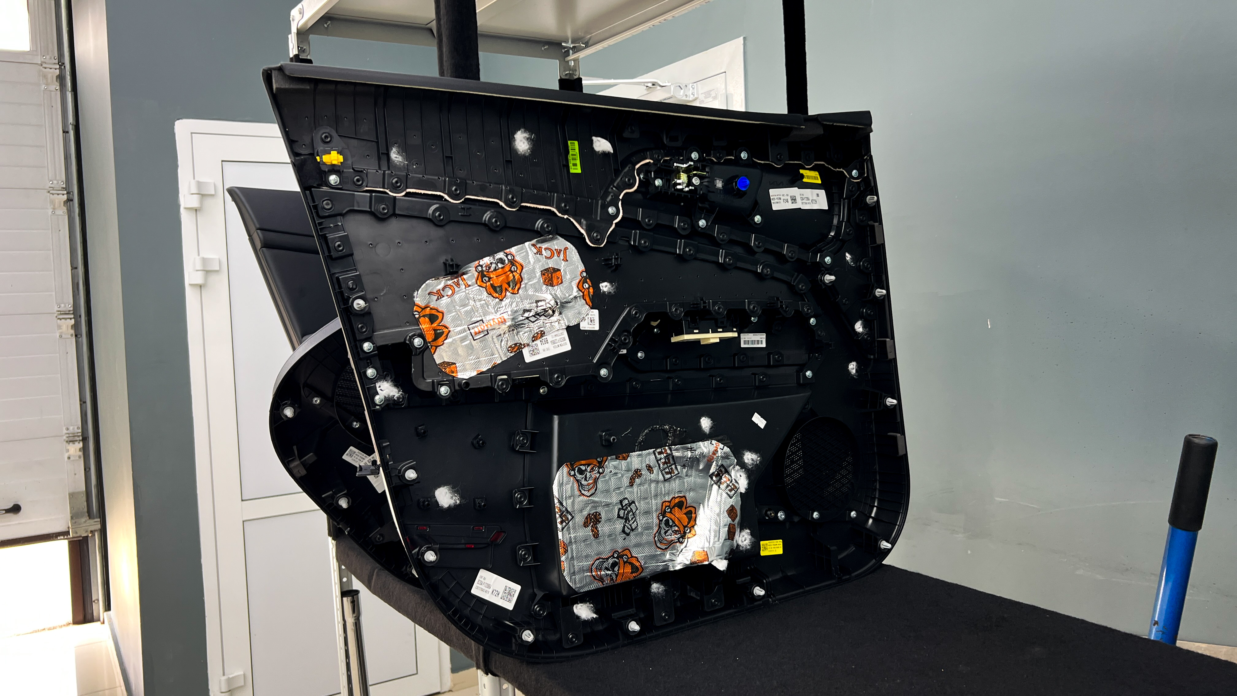 Приступаем к шумоизоляции дверей Kia Sportage (Киа Спортейдж). Разбираем все дверные обшивки. Убираем их на специальный стеллаж, чтобы не повредить.