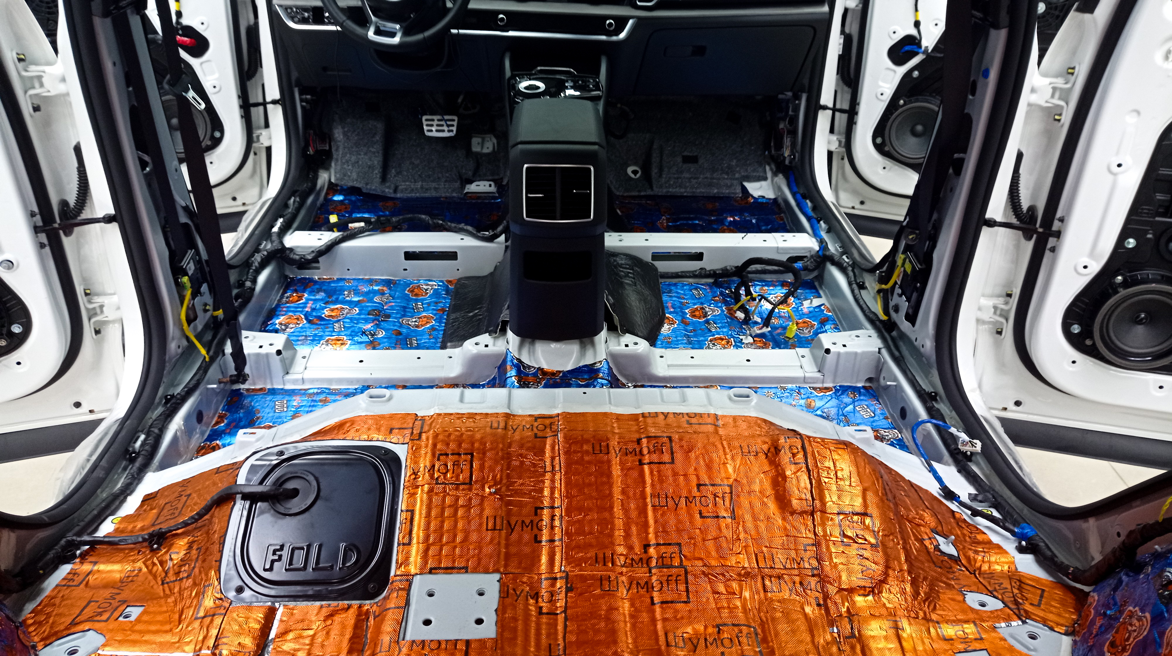 Пол от моторной перегородки и до заднего сиденья оклеивается толстой виброизоляцией Шумофф Super Jack. Под заднее сиденье клеится виброизоляция Шумофф Black Jack.