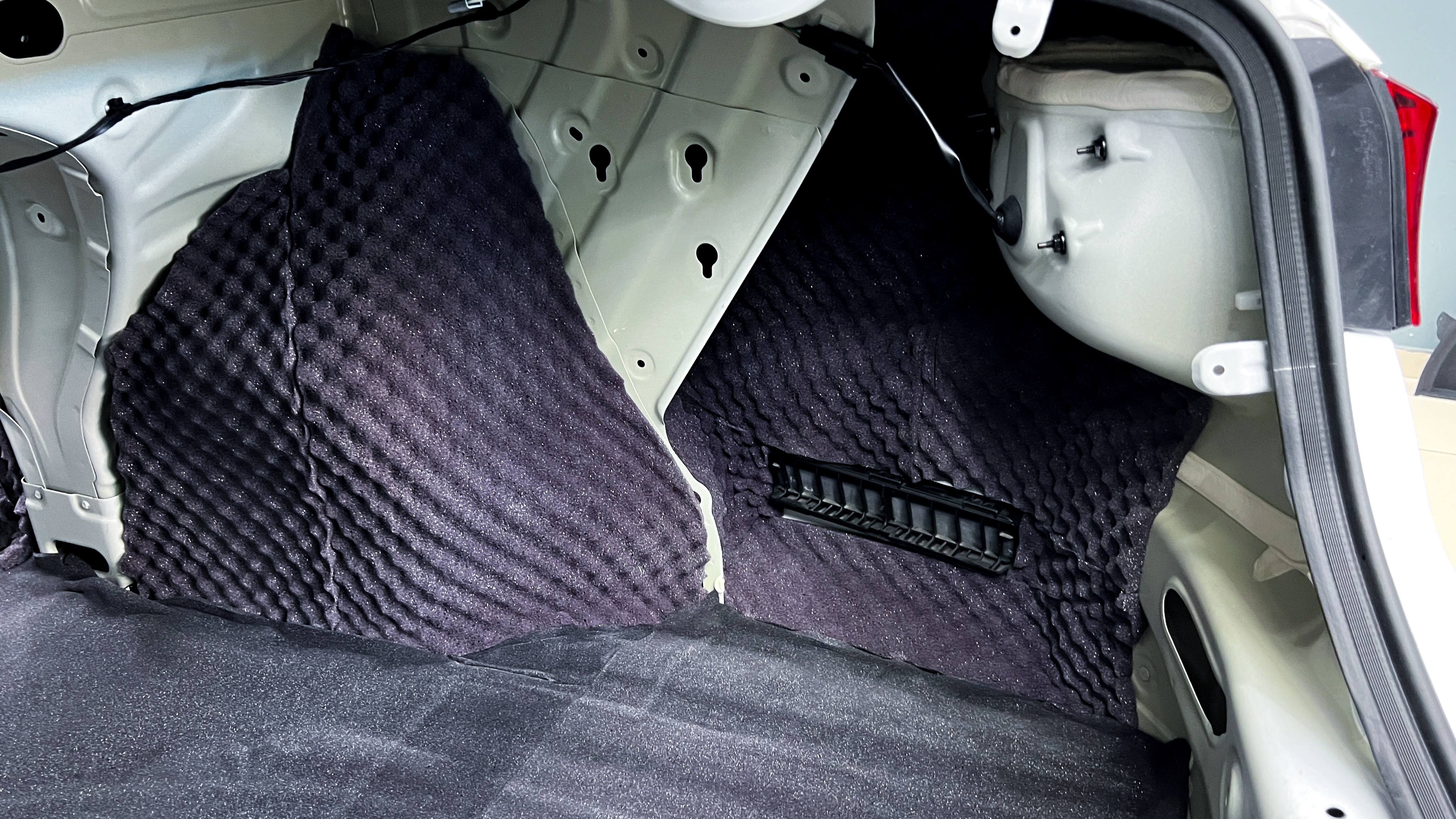Обезжириваем поверхность и приступаем к монтажу второго слоя. Также для получения более эффективного результата используем компоновку из двух материалов На дно багажника клеим Шумофф Base 4. Этот слой позволит снизить нам шум от дороги.