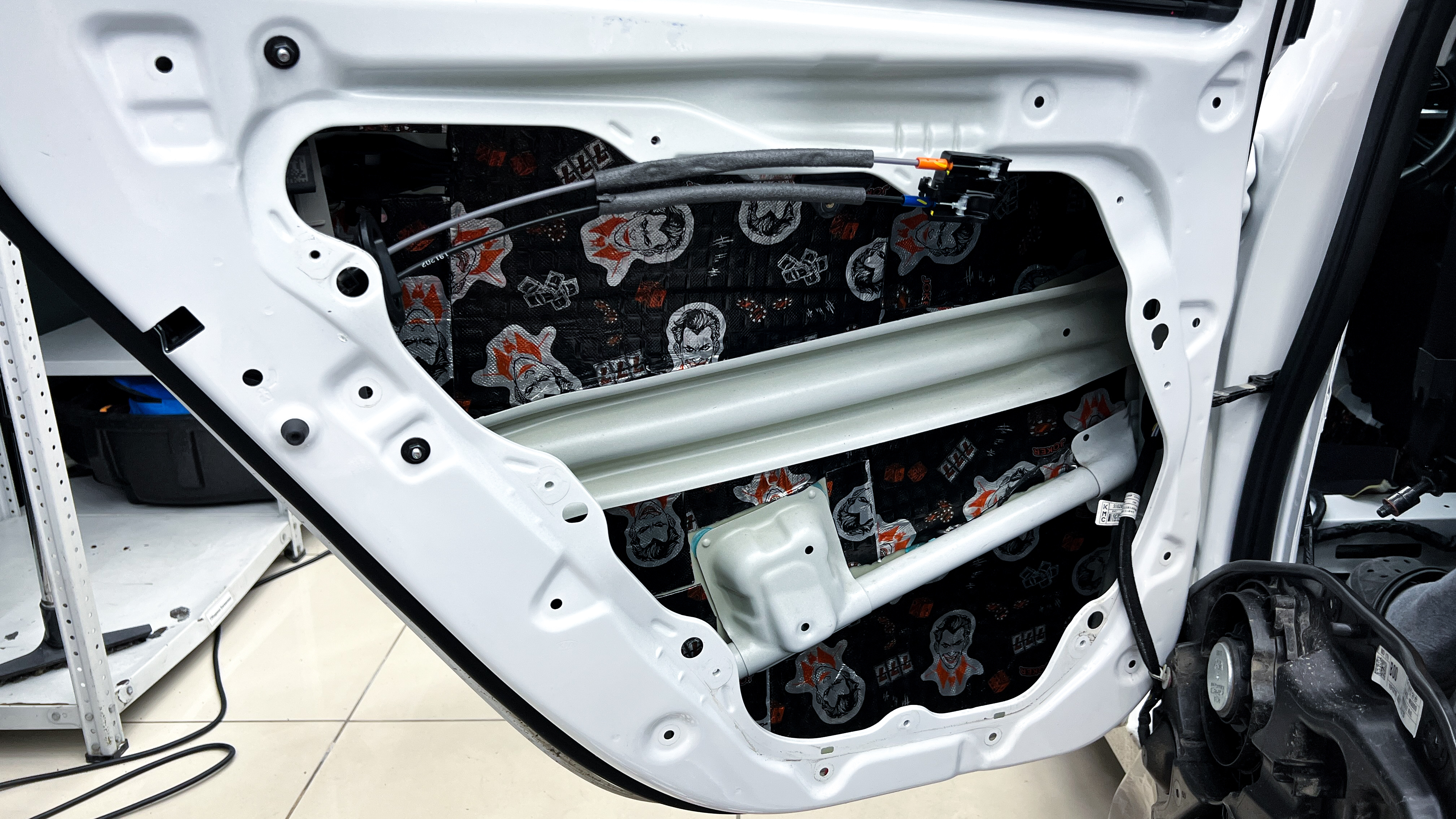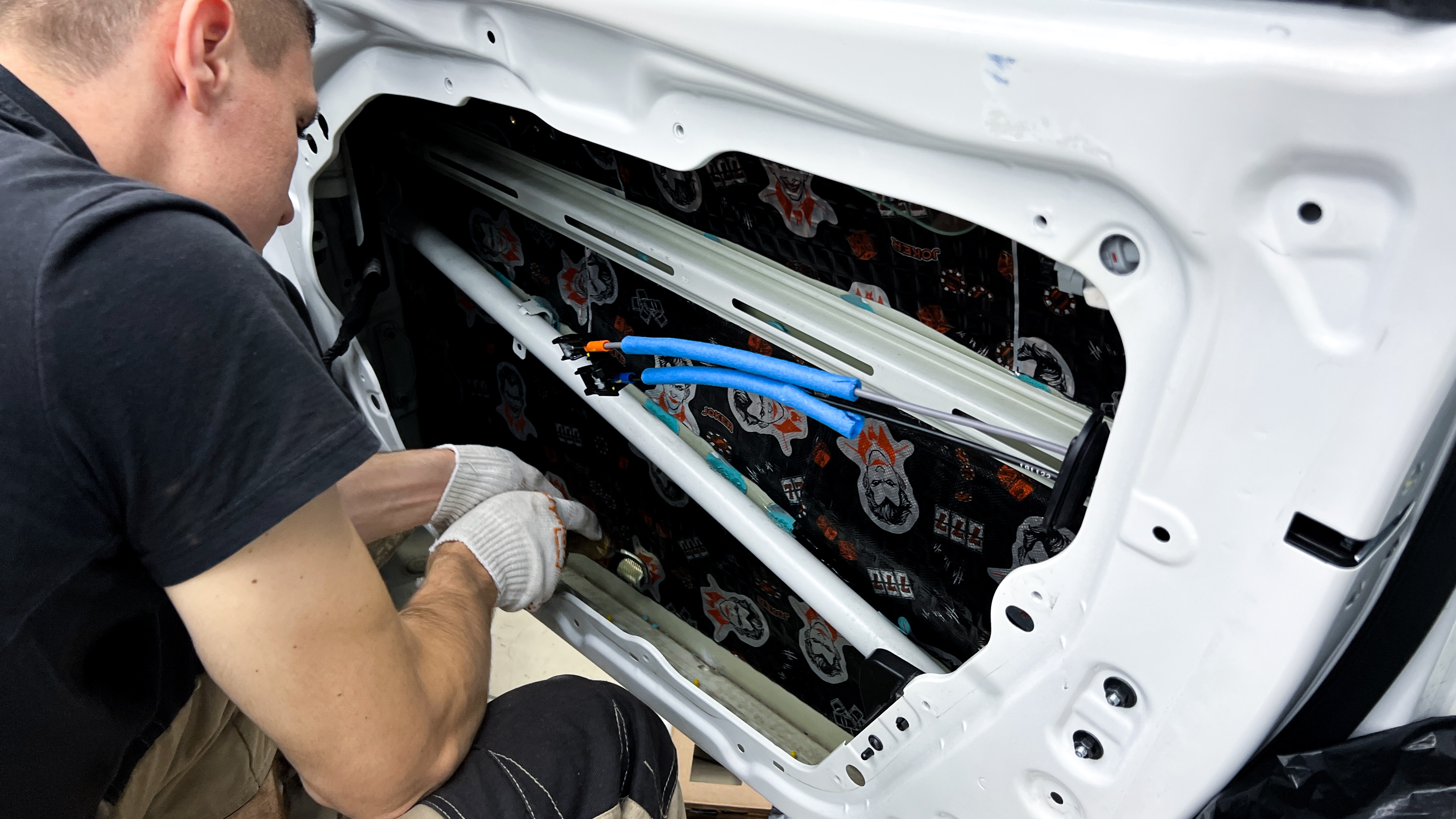 Переходим к оклейке самого корпуса панели, первым слоем частично наносим виброизоляцию Шумофф Joker, создавая тем самым идеальный баланс. Такая частичная оклейка позволит нам чрезмерно не утяжелять панель и придать ей необходимую сбитость