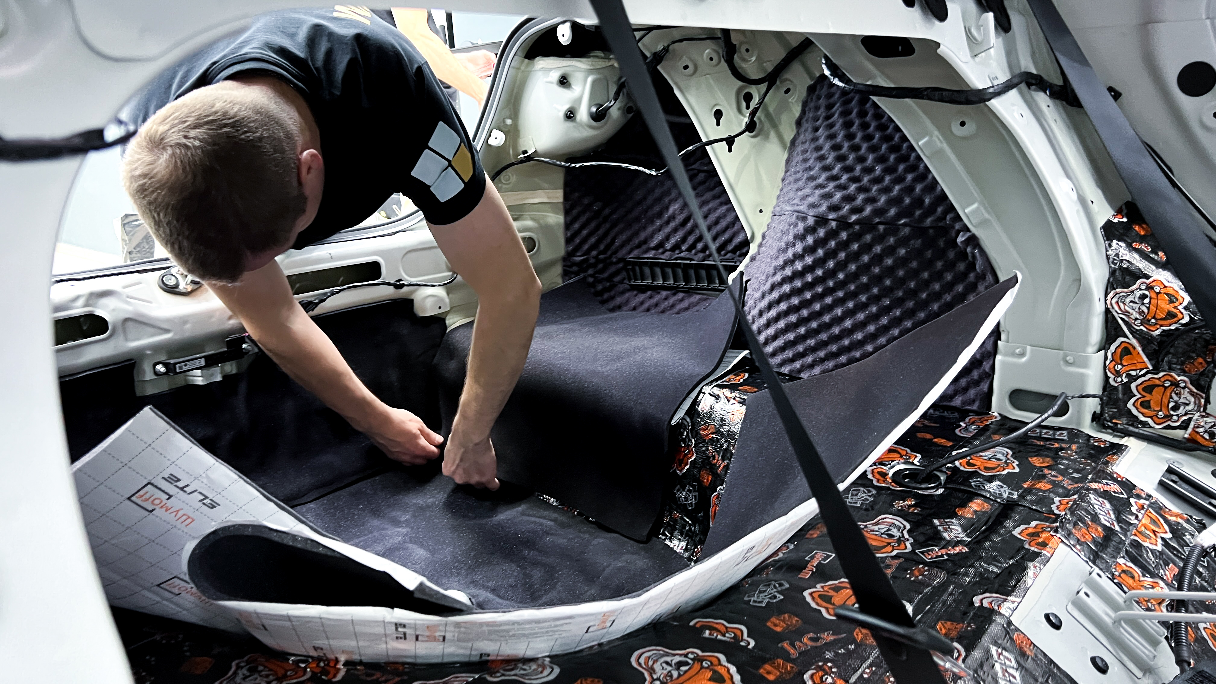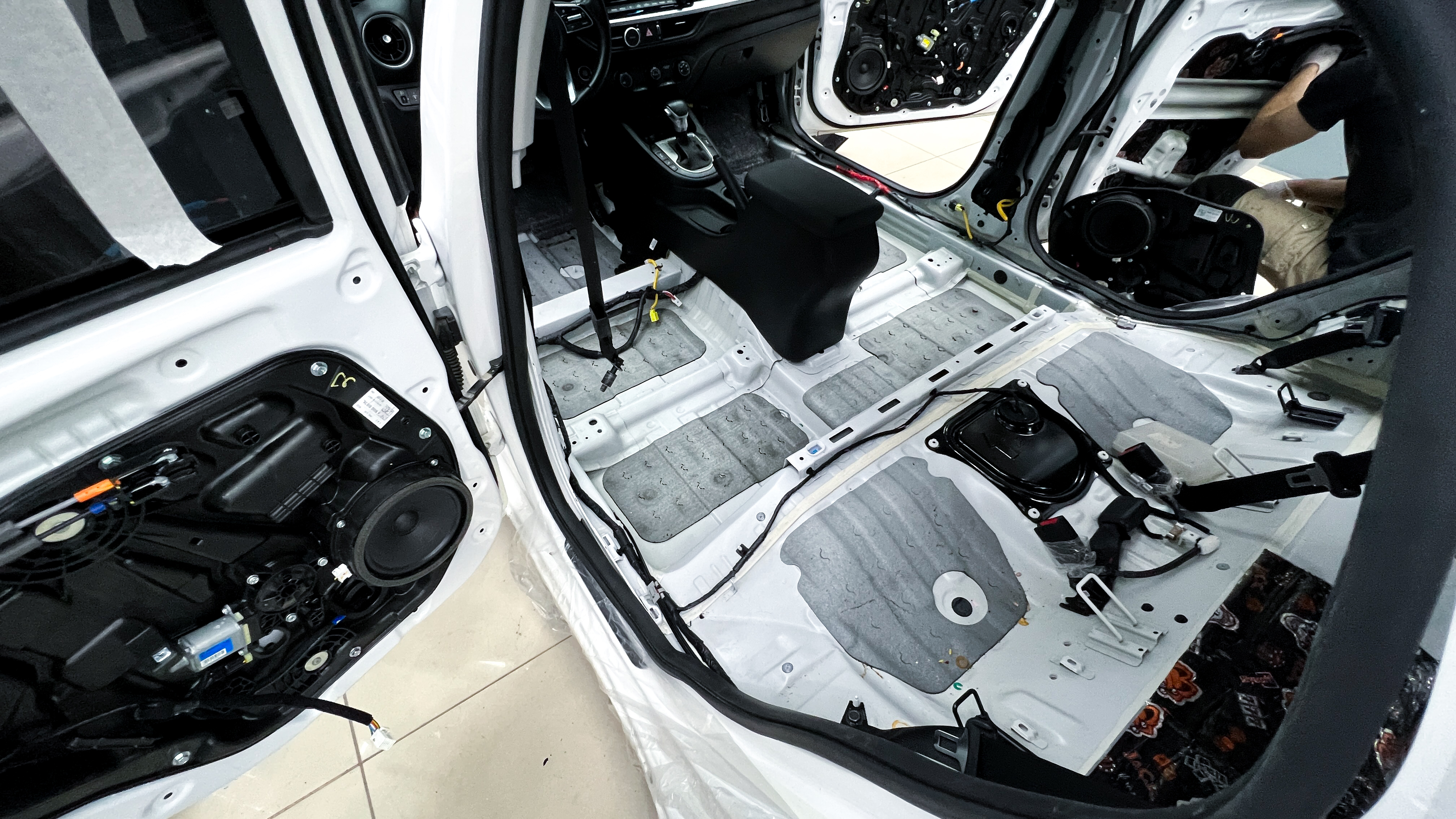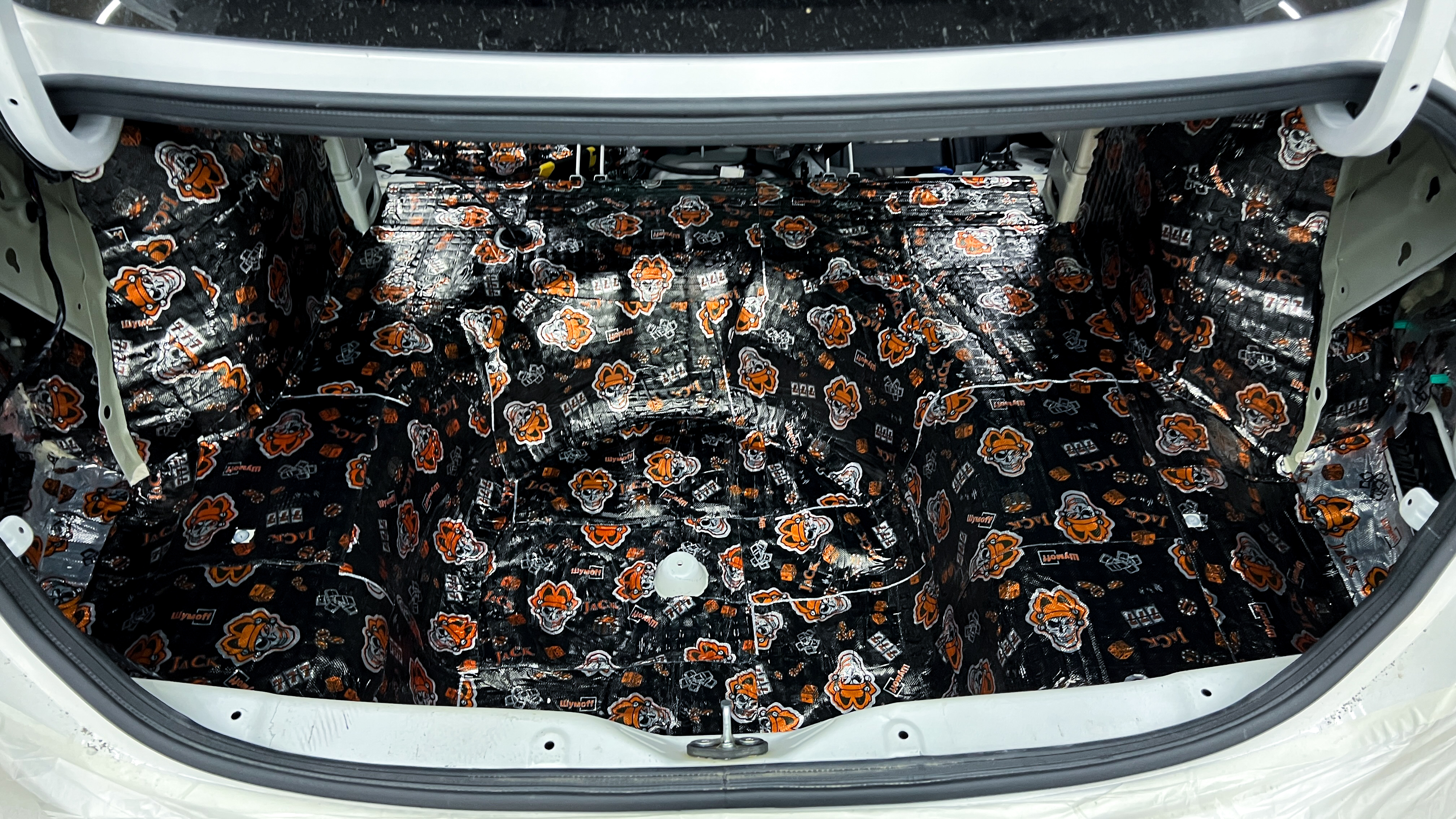 Дно багажника и крылья оклеиваются шумо и теплоизолятором Шумофф П4 4. Арки оклеиваются шумопоглотителем Flex A15.