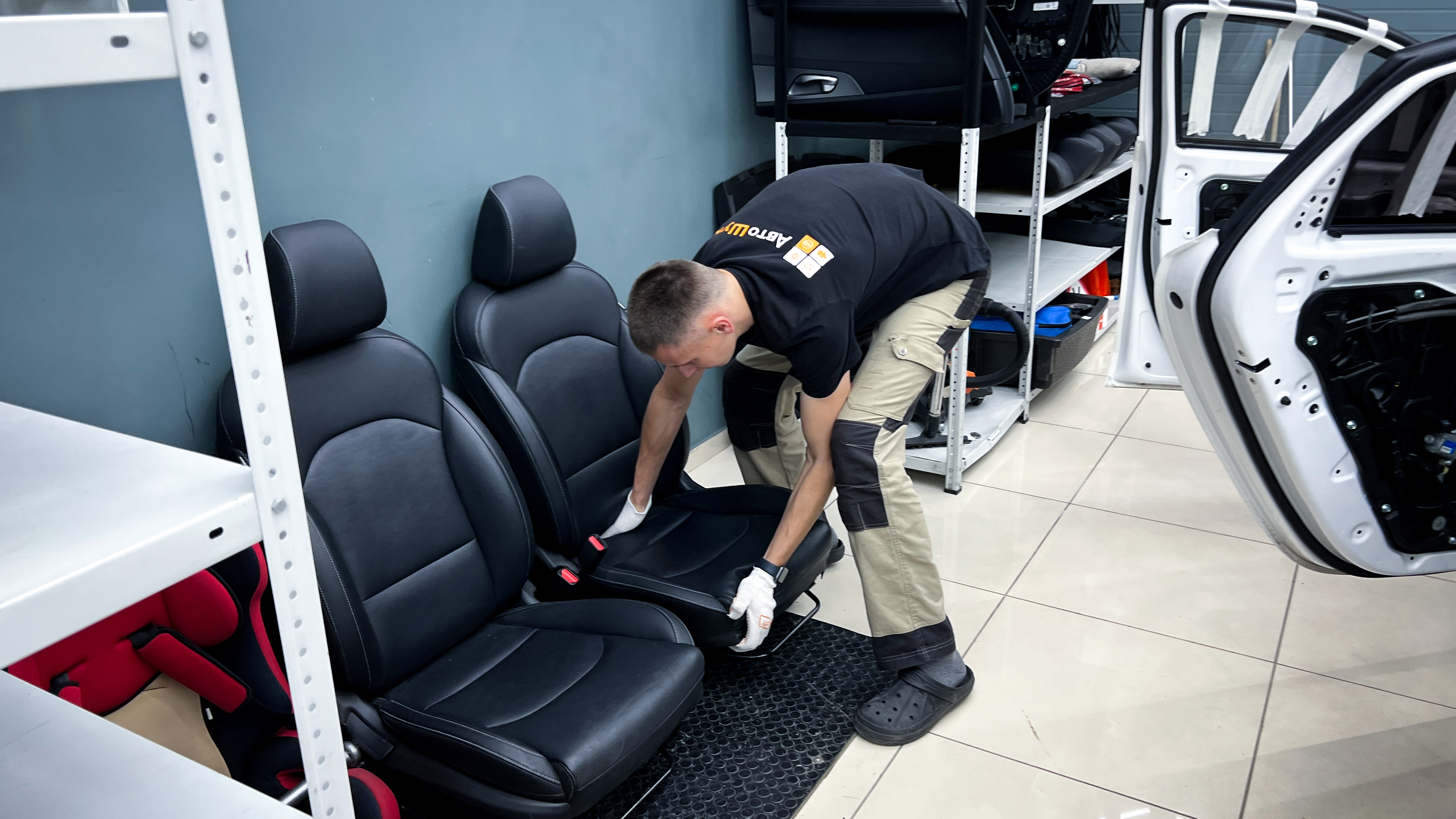Приступаем к разбору салона: аккуратно вынимаем сиденья, среднюю консоль, обшивки и ковер и складываем все на специальный стеллаж.