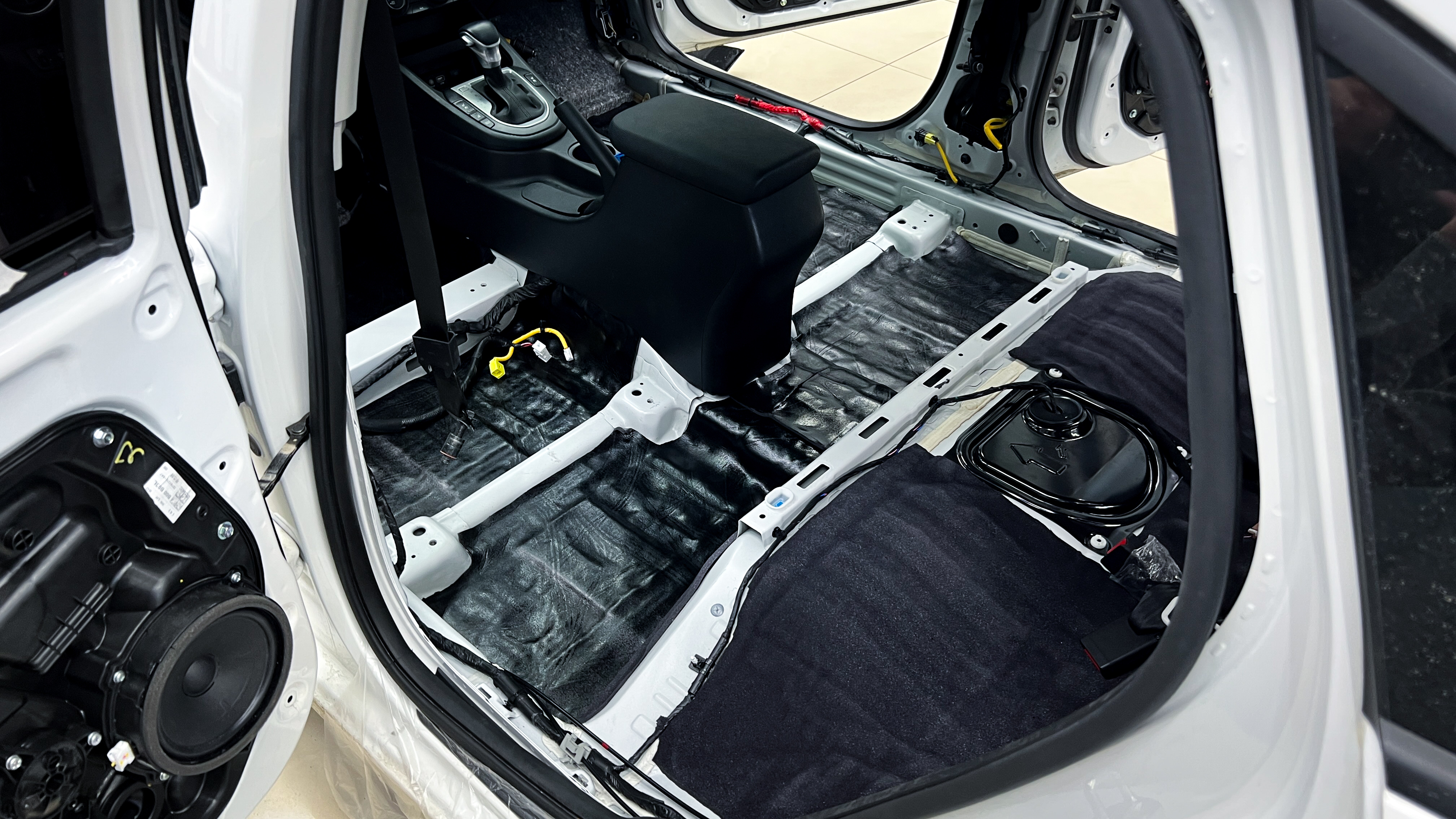 От моторной перегородки и до заднего сиденья вмести с ним клеится мощный многослойный шумо и звукоизолятор Шумофф Prizma 6.