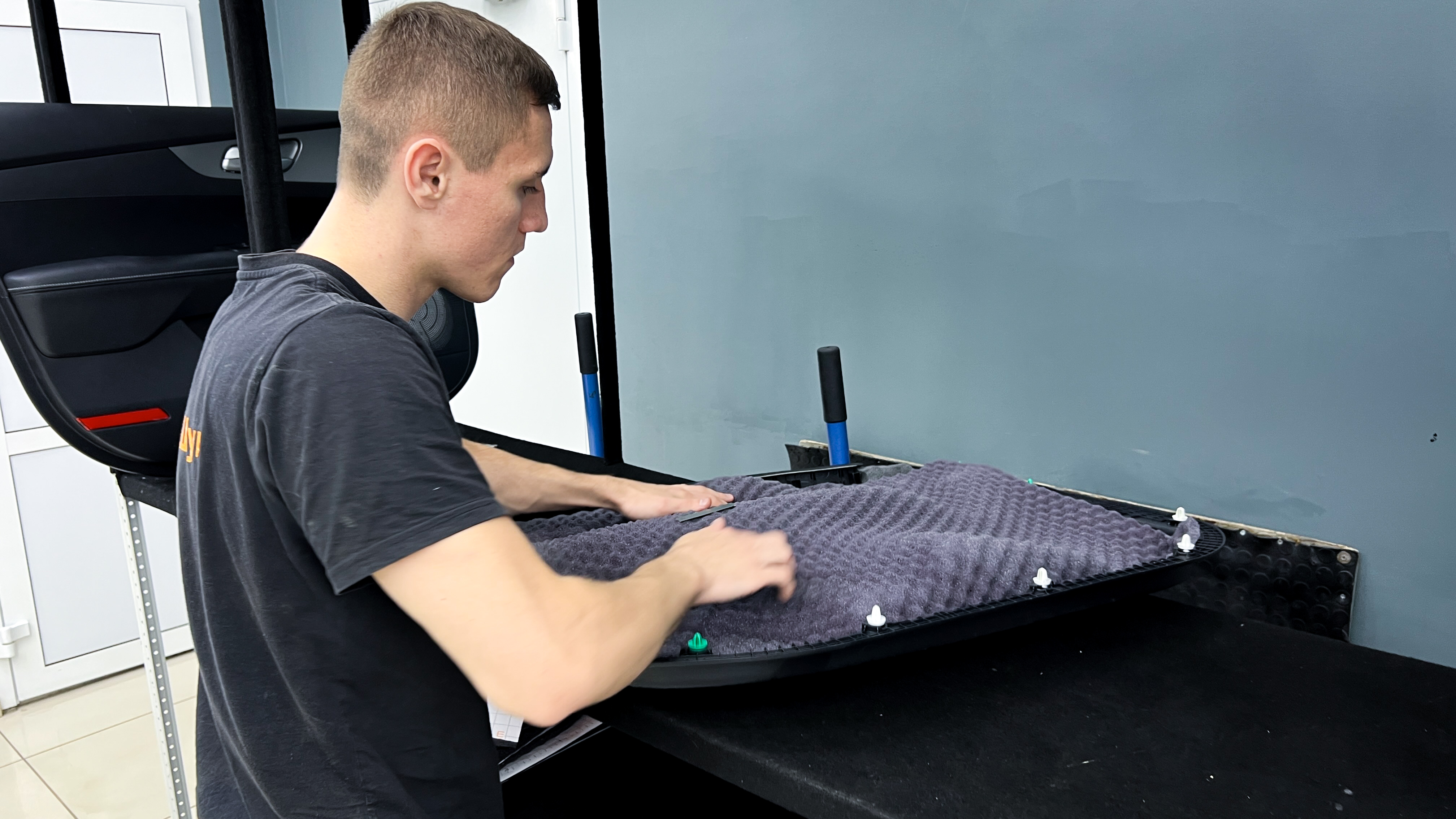 Внутренняя поверхность обивки оклеивается шумопоглотителем Flex А15.