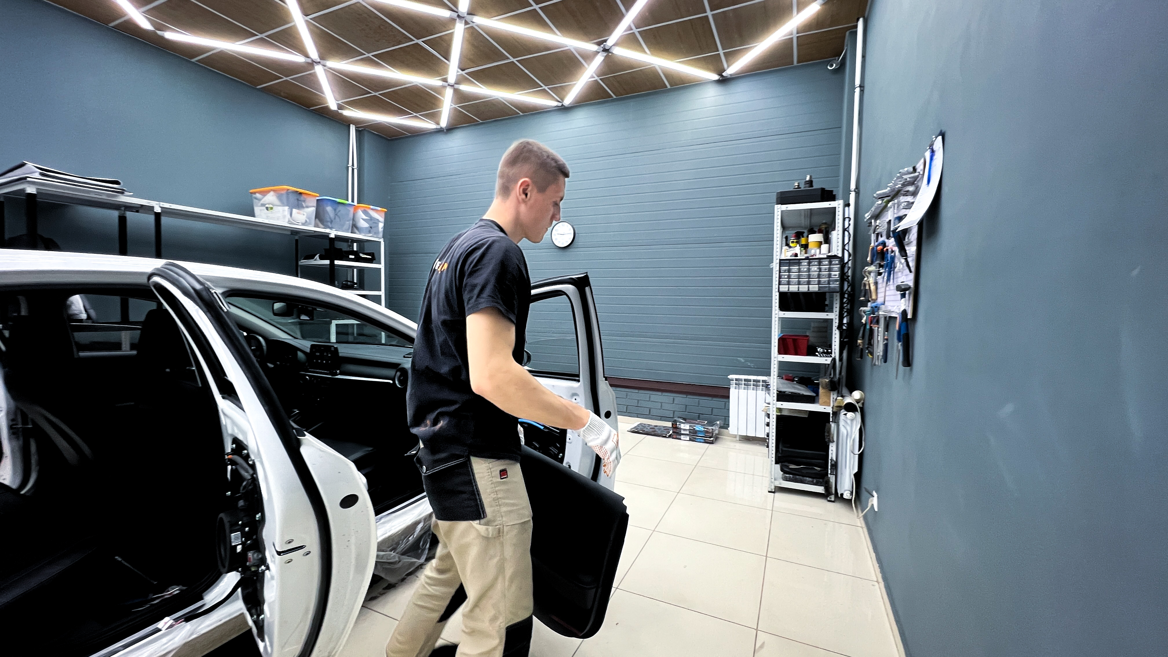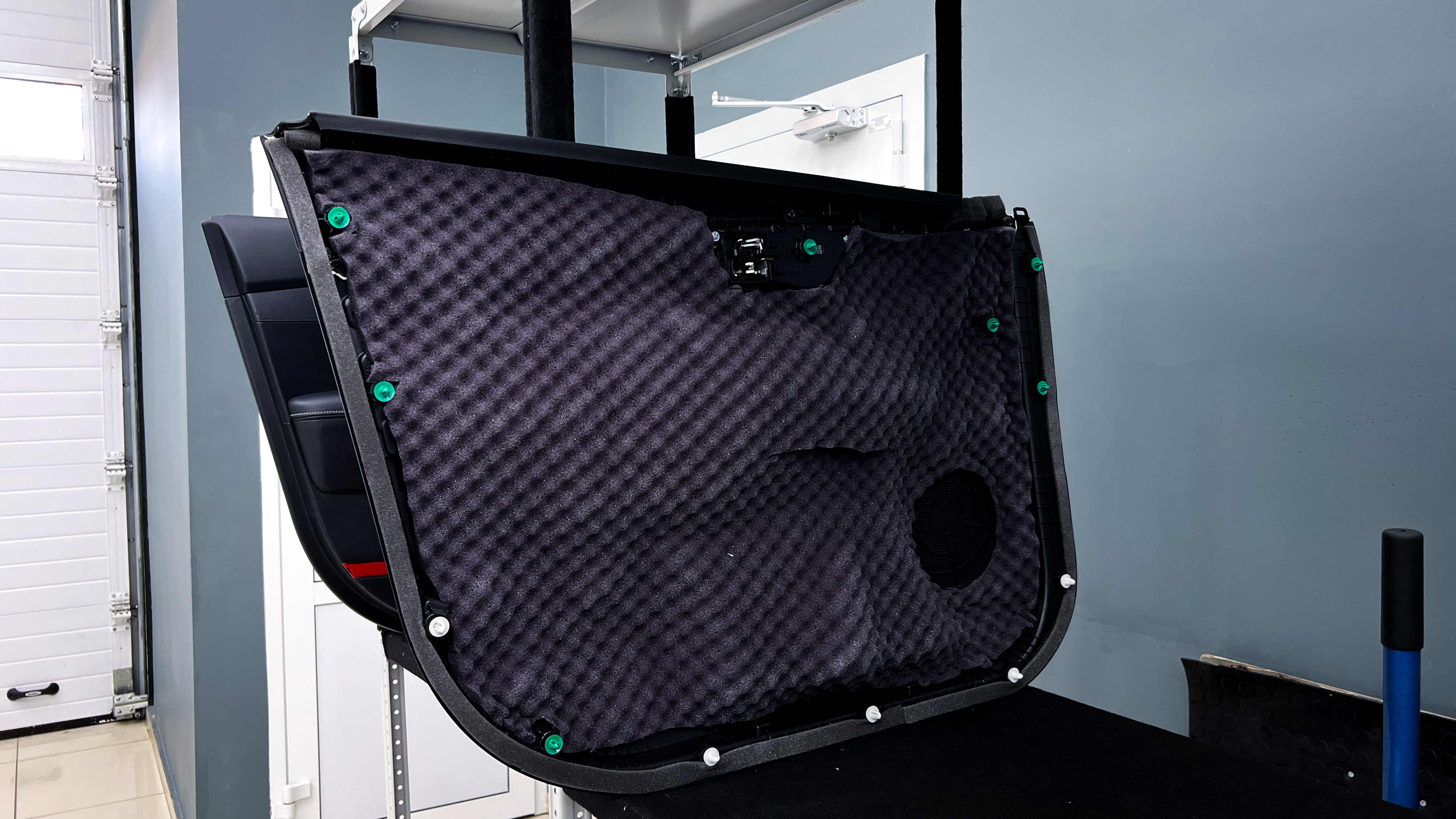 Приступаем к шумоизоляции дверей. Разбираем все дверные обшивки. Убираем их на специальный стеллаж, чтобы не повредить.