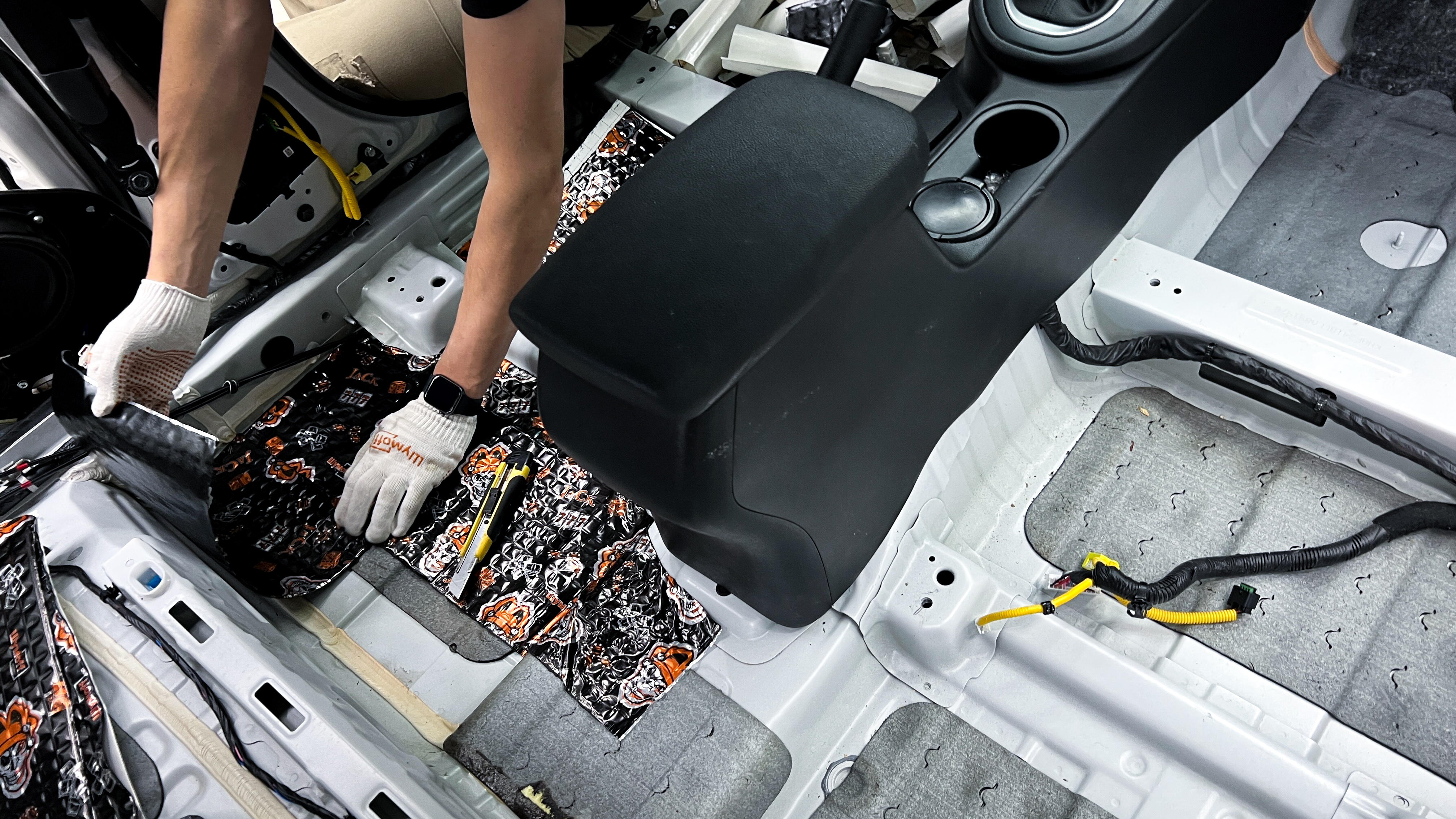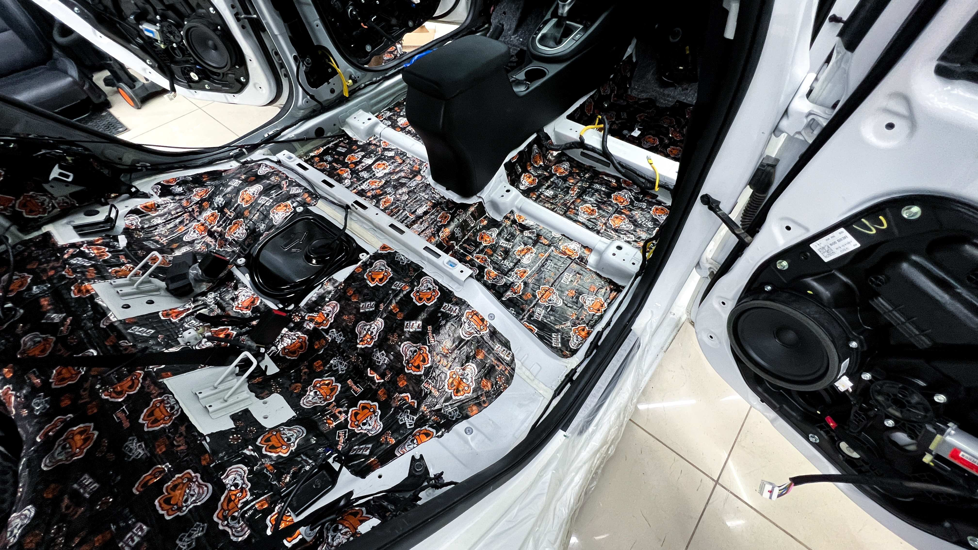 Пол от моторной перегородки и до заднего сиденья оклеивается толстой виброизоляцией Шумофф Super Jack. Под заднее сиденье клеится виброизоляция Шумофф Black Jack.