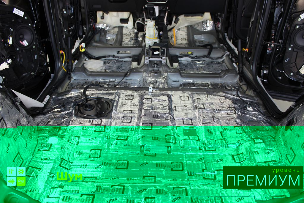 От моторной перегородки и до заднего сиденья вмести с ним клеится мощный многослойный шумо и звукоизолятор Шумофф Prizma 6.