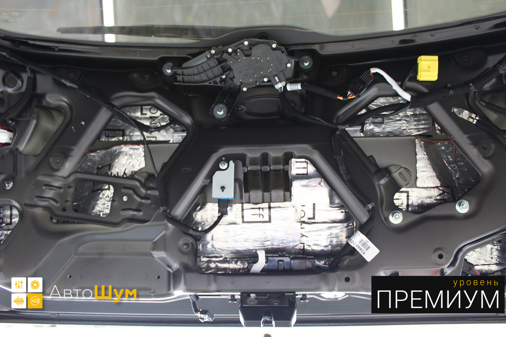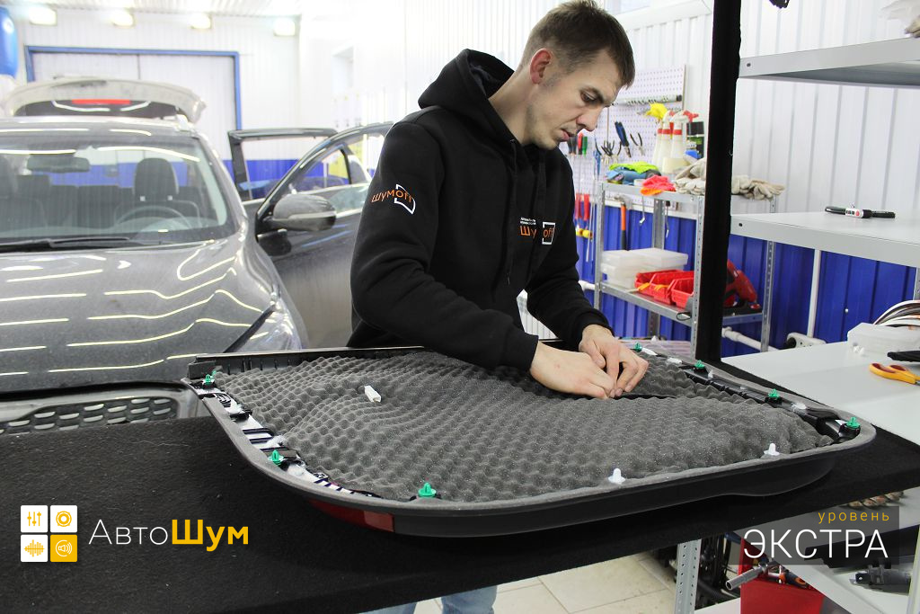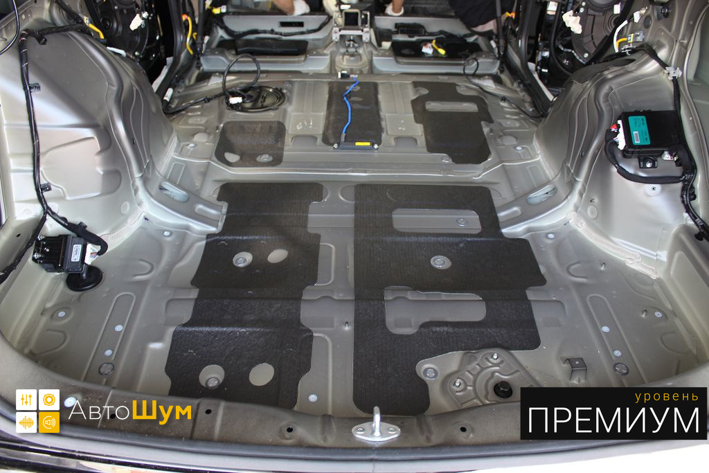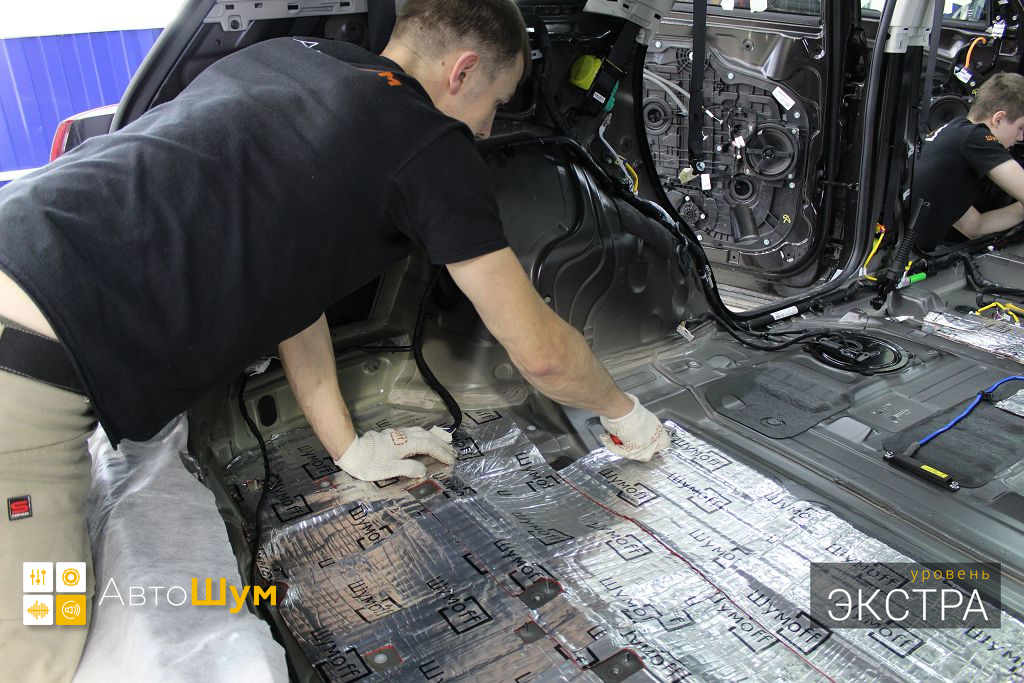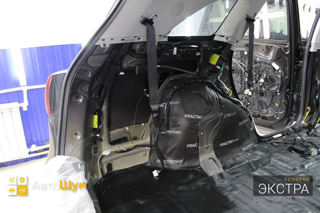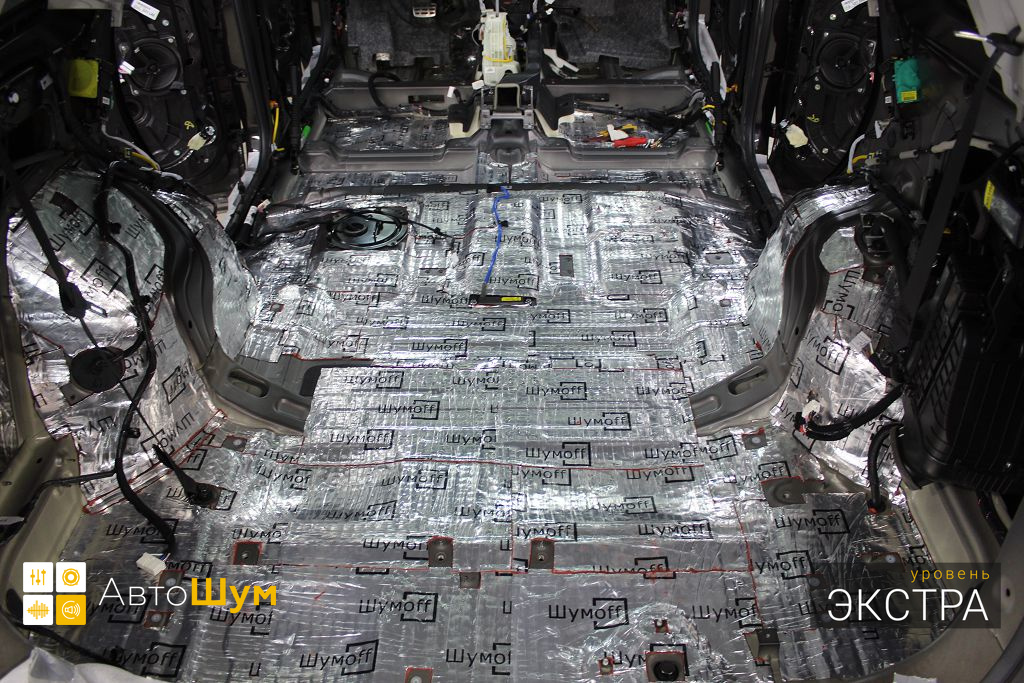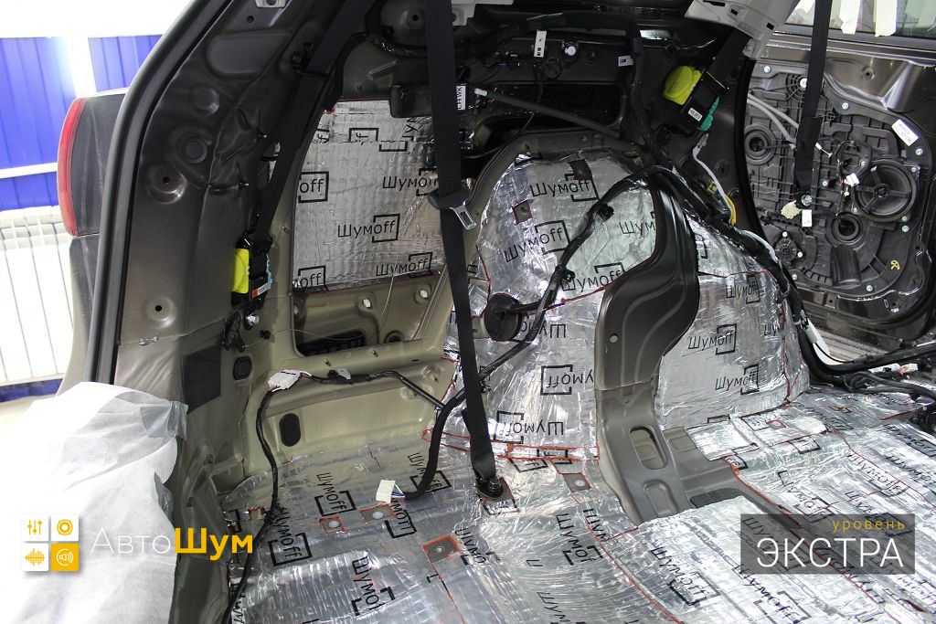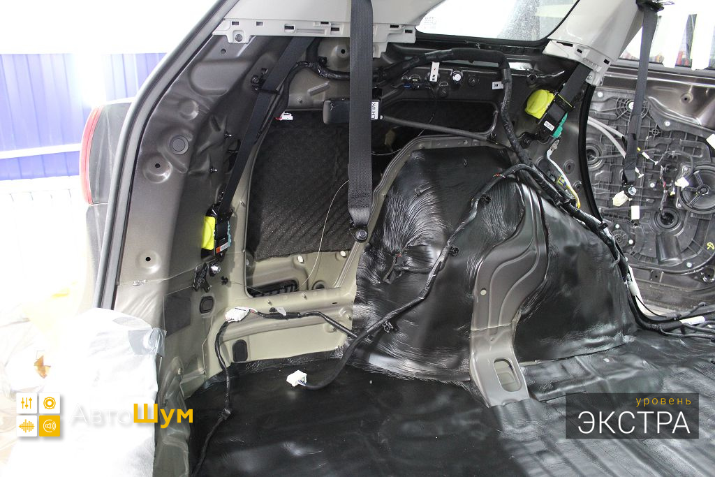 Дно багажника и крылья оклеиваются шумо и теплоизолятором Шумофф П4 4. Арки оклеиваются шумопоглотителем Flex A15.