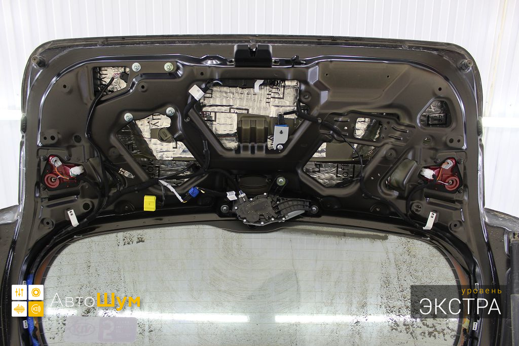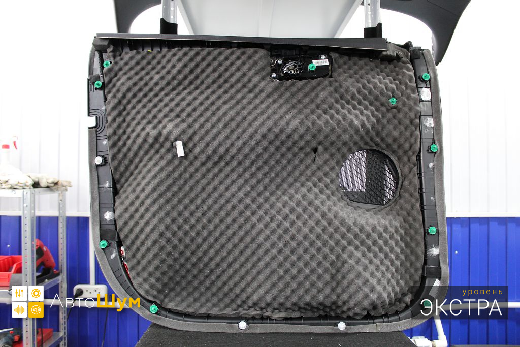 Обшивку пятой двери оклеиваем Flex А15, для устранения ненужных скрипов и бряков.