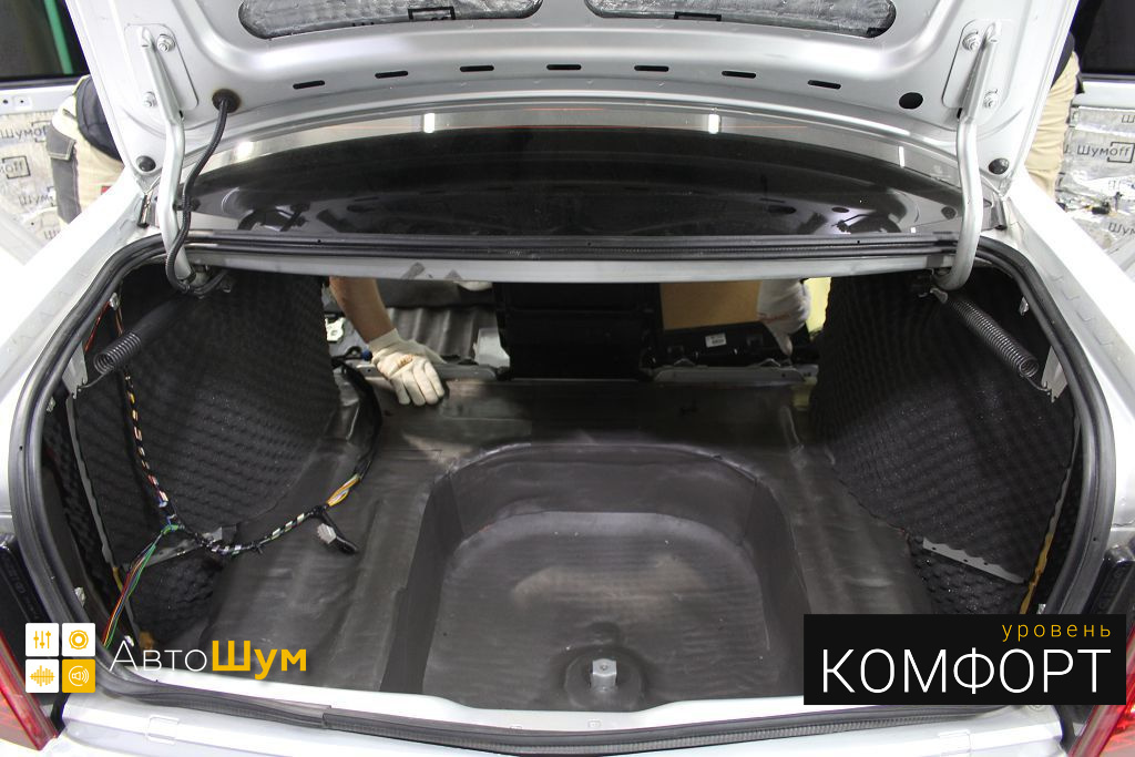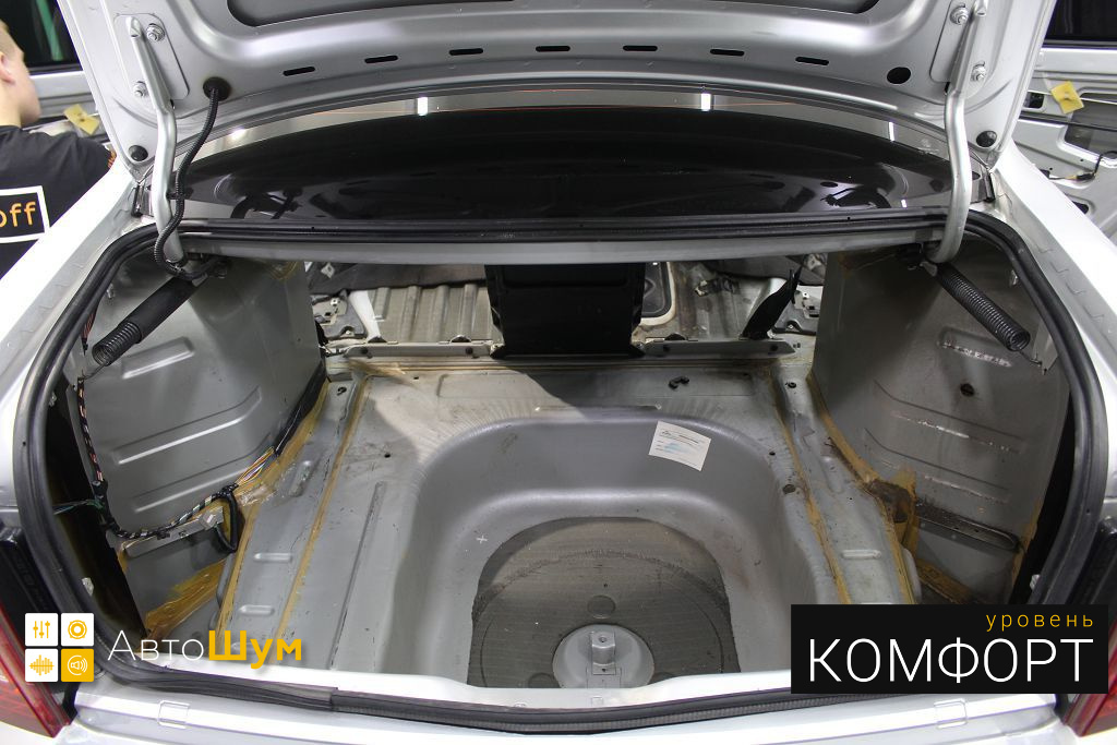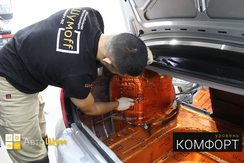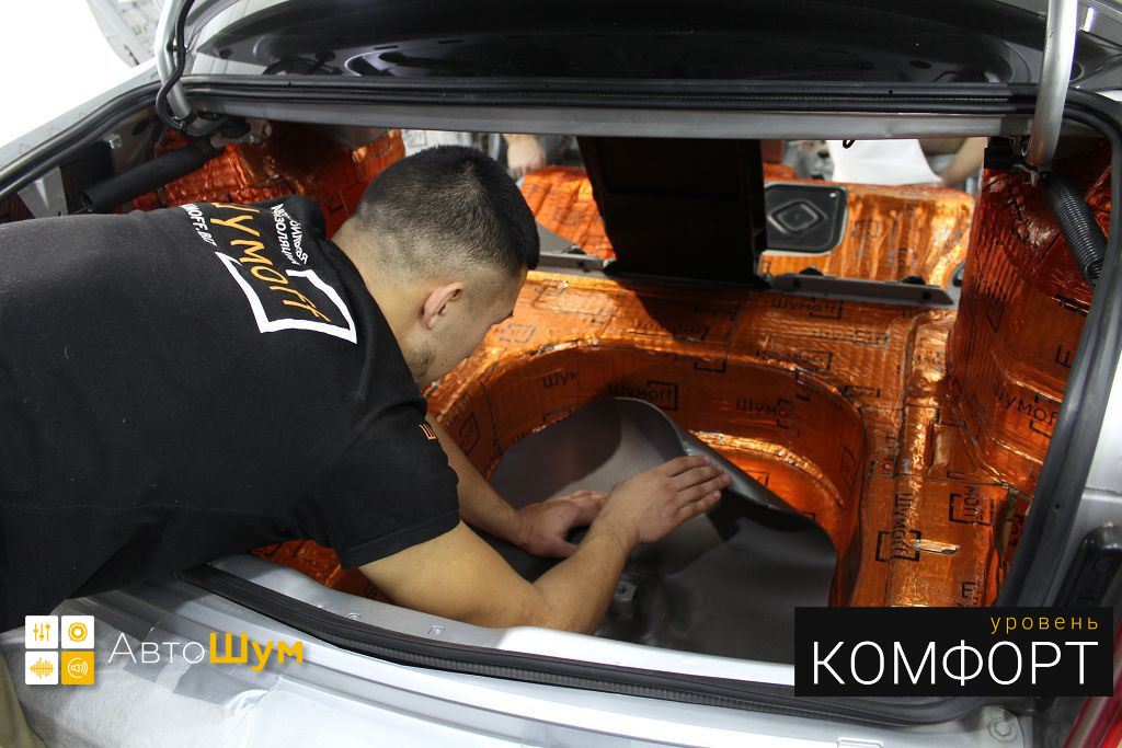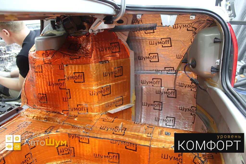 Дно багажника и крылья оклеиваются шумо и теплоизолятором Шумофф П4 4. Арки оклеиваются шумопоглотителем Flex A15.