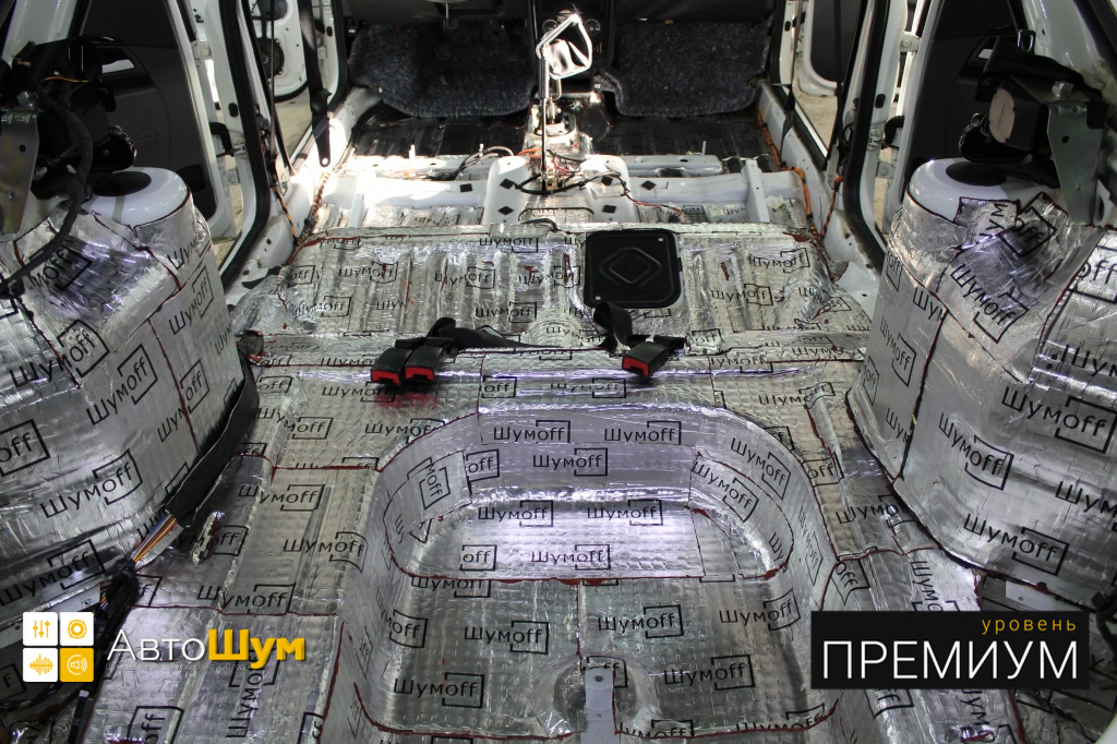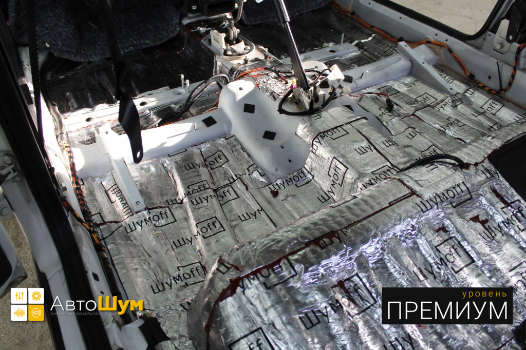 Пол от моторной перегородки и до заднего сиденья оклеивается толстой виброизоляцией Шумофф Super Jack. Под заднее сиденье клеится виброизоляция Шумофф Black Jack.