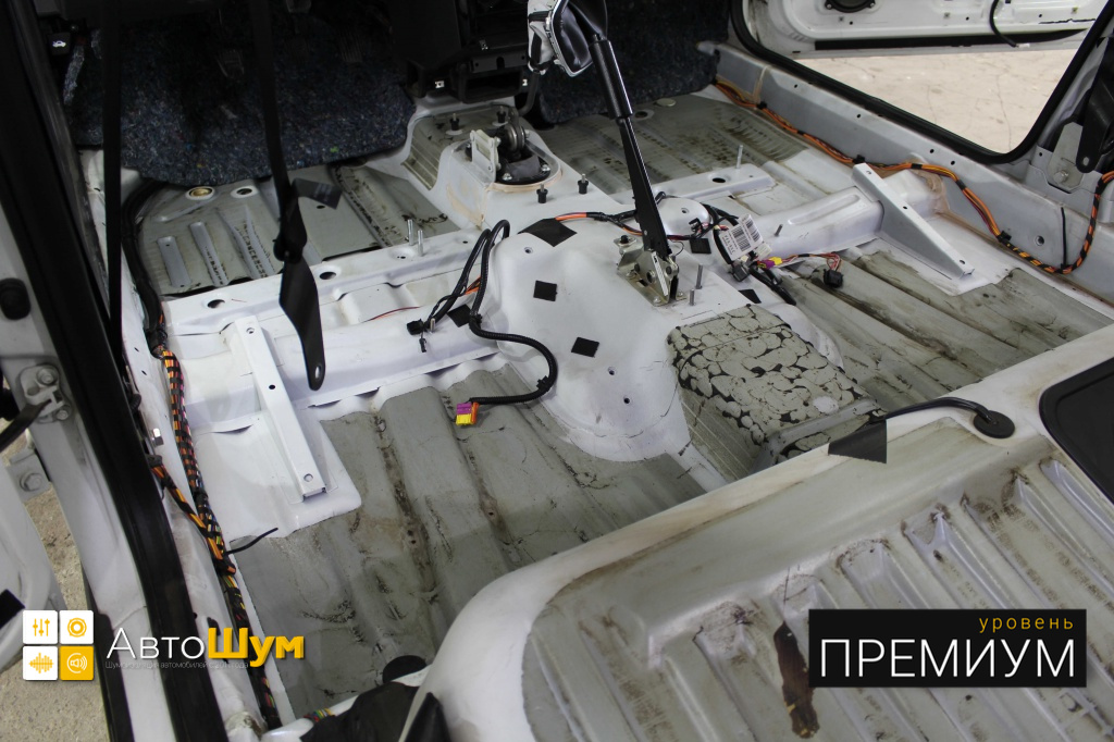От моторной перегородки и до заднего сиденья вмести с ним клеится мощный многослойный шумо и звукоизолятор Шумофф Prizma 6.