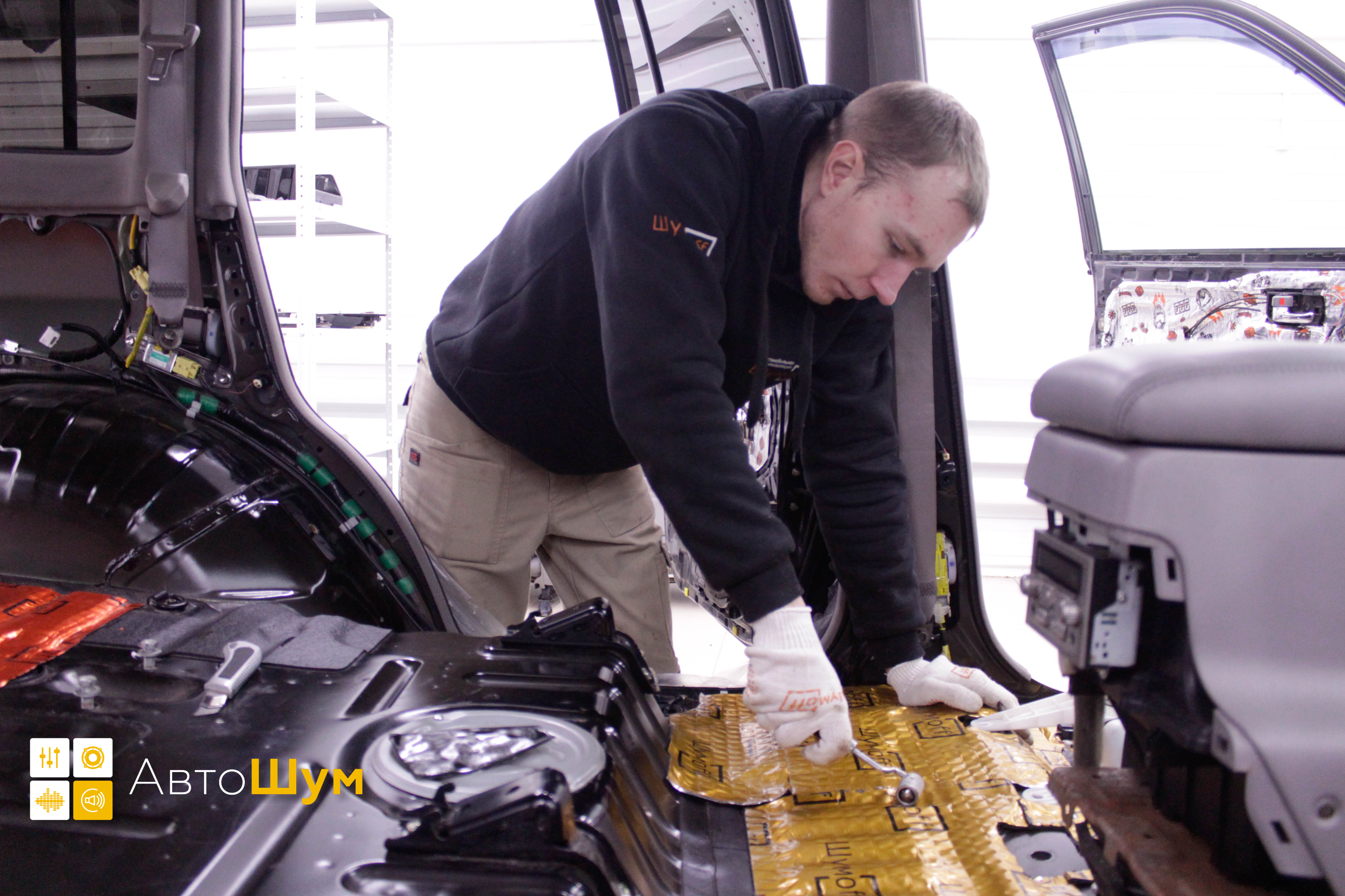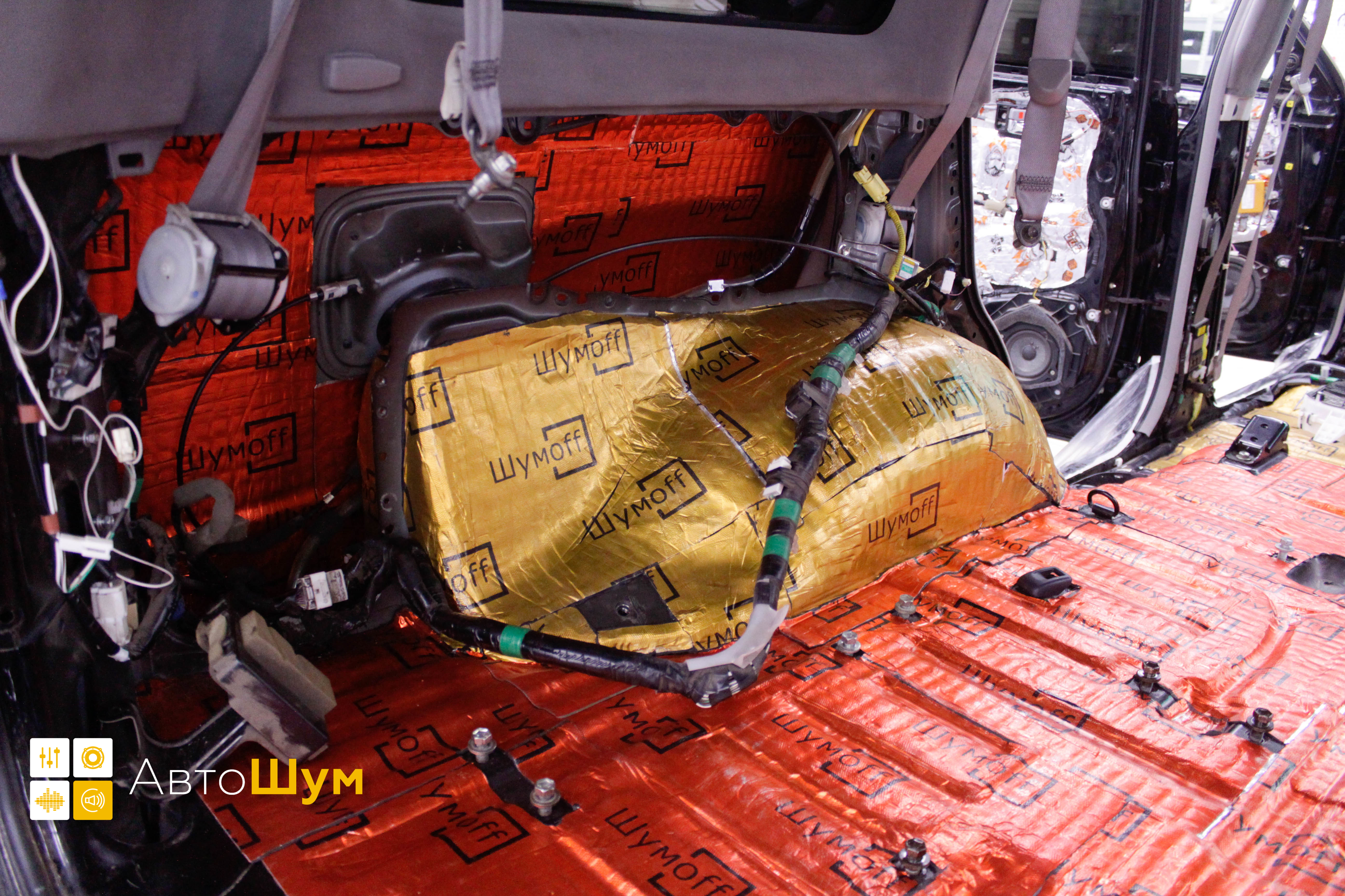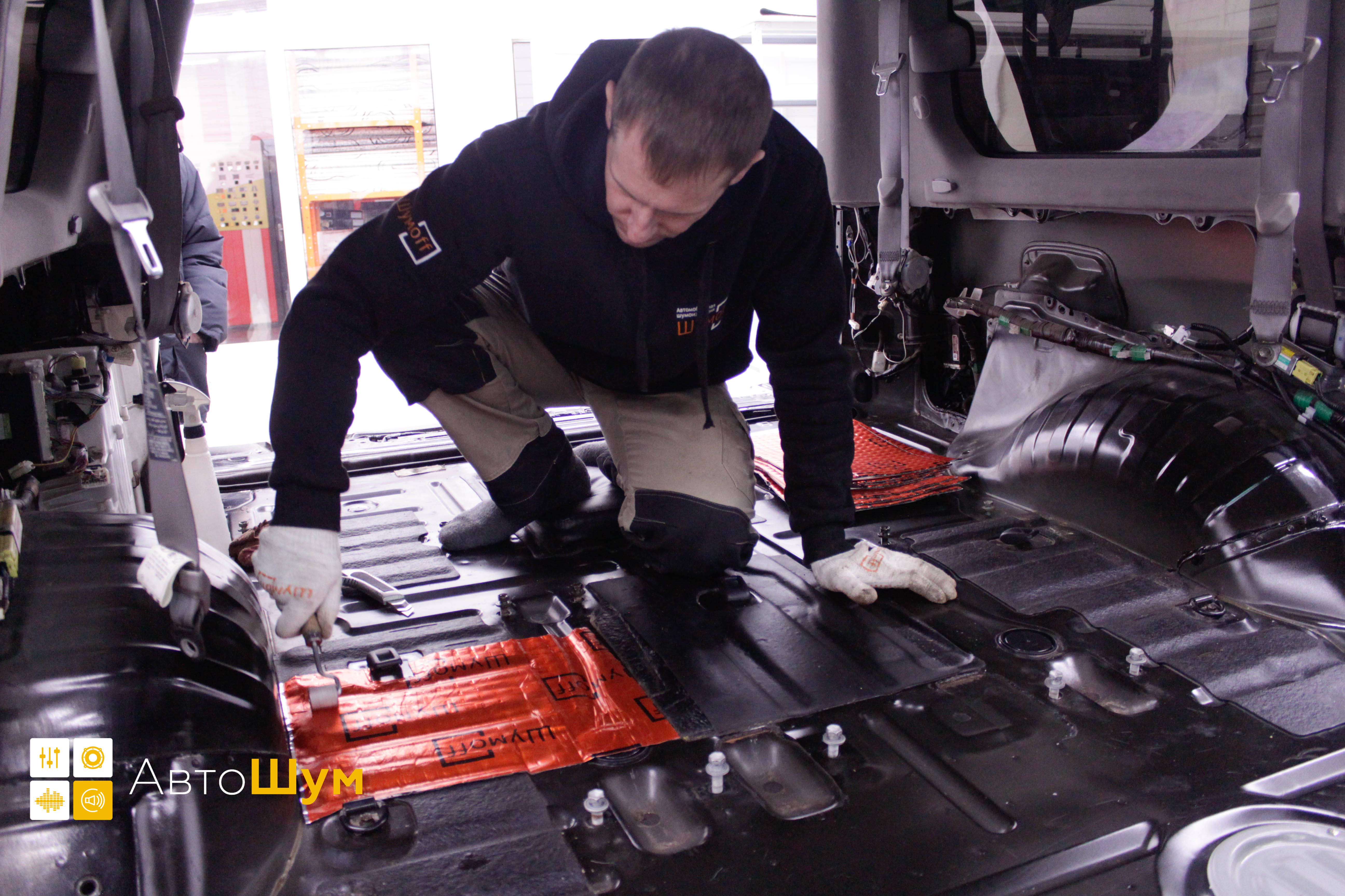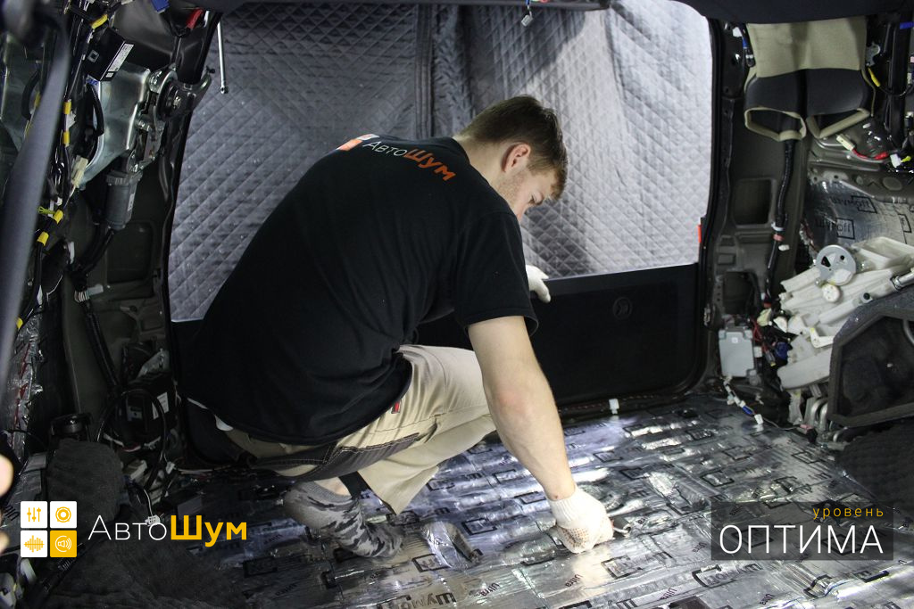 Дно оклеивается многослойным шумо и звукоизолятором Шумофф Prizma 6, крылья, арки и крышка багажника шумопоглотителем Absorber A15.