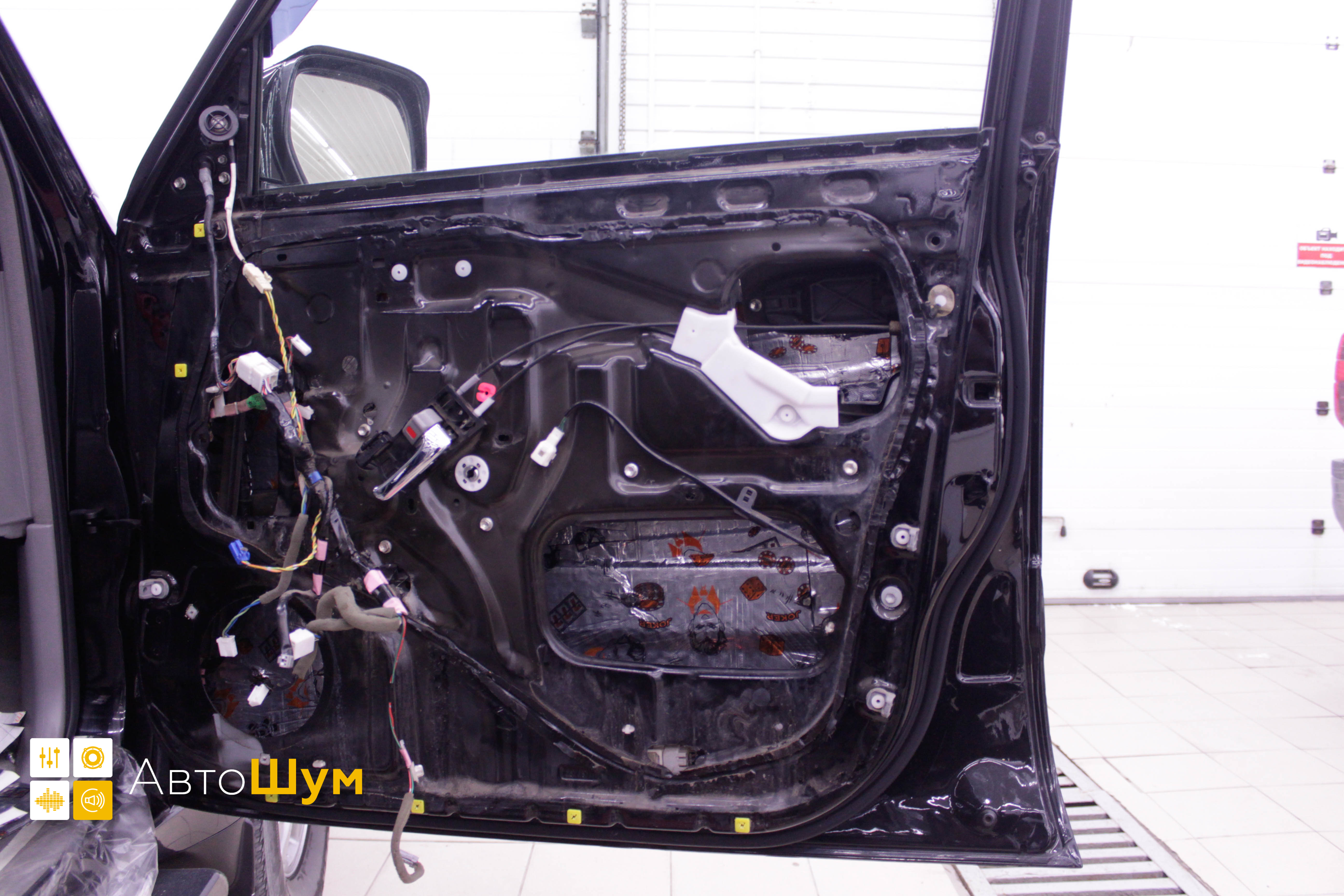Оклеиваем технические отверстия в двери Лексус ЛХ 570 Для второго слоя на технологические отверстия используем так же Шумофф Joker.