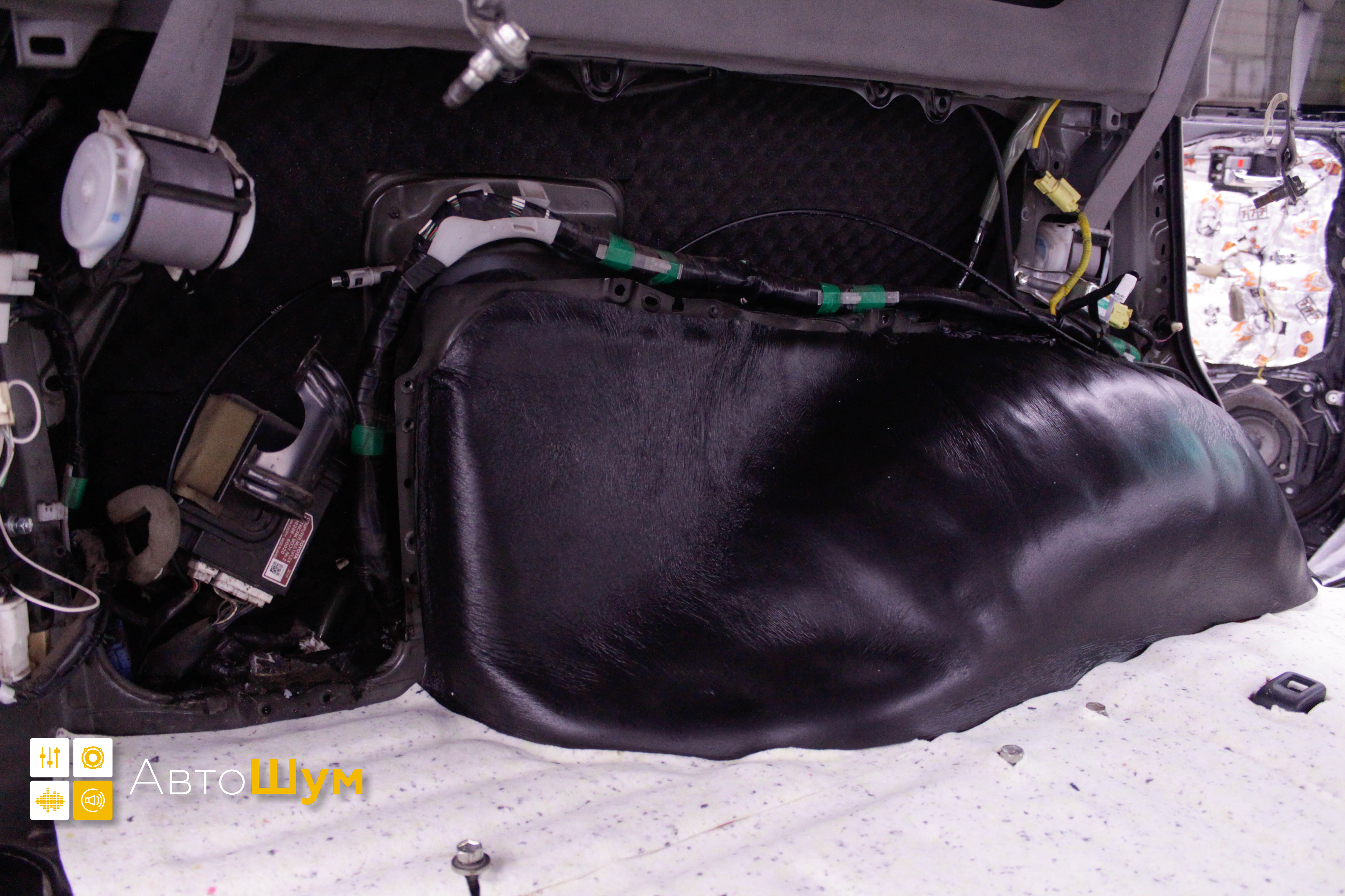 От моторной перегородки и до заднего сиденья вмести с ним клеится мощный многослойный шумо и звукоизолятор Шумофф Prizma 6.
