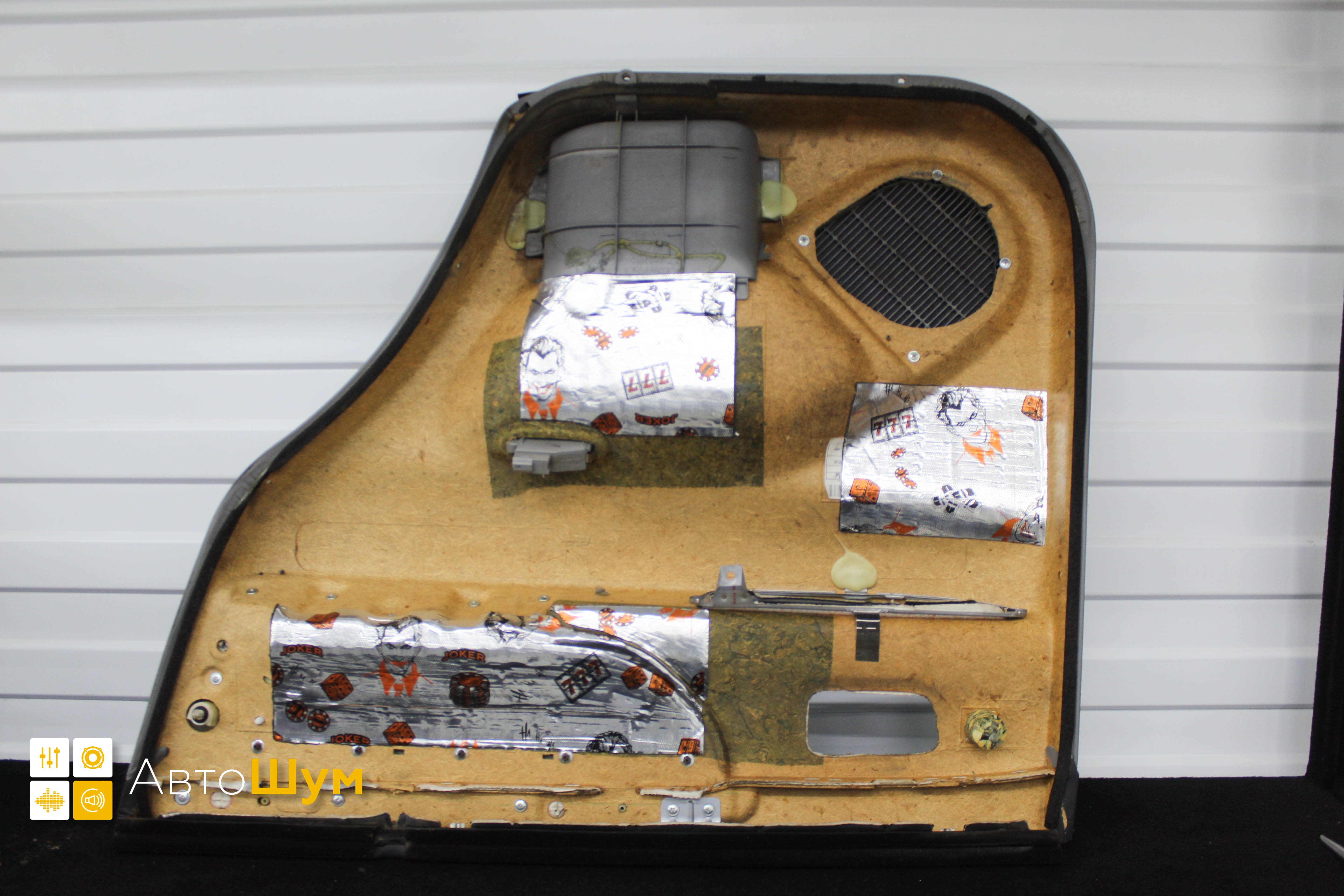 Первым слоем на внутреннюю часть двери клеим виброизоляцию Шумофф Joker.
