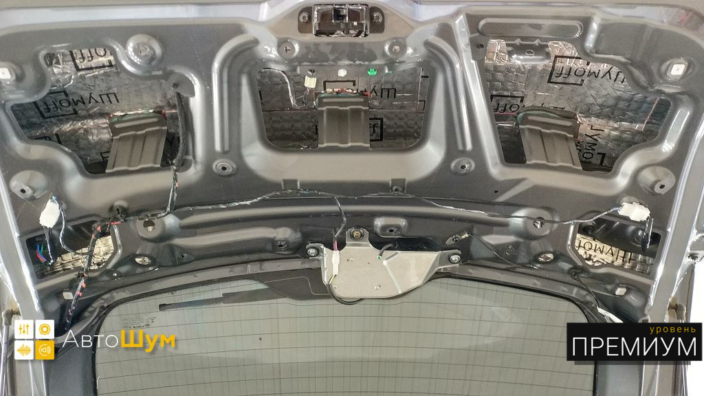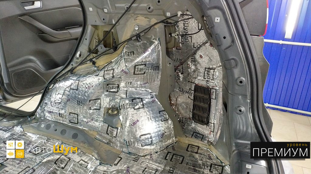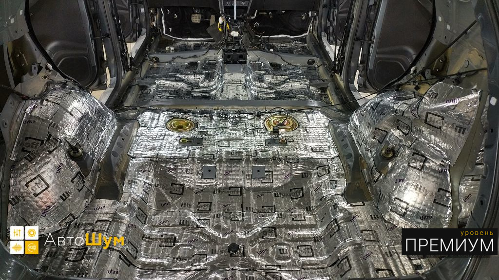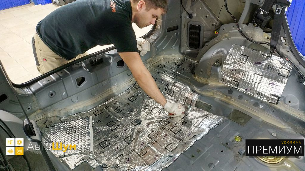 Дно багажника и крылья оклеиваются шумо и теплоизолятором Шумофф П4 4. Арки оклеиваются шумопоглотителем Flex A15.