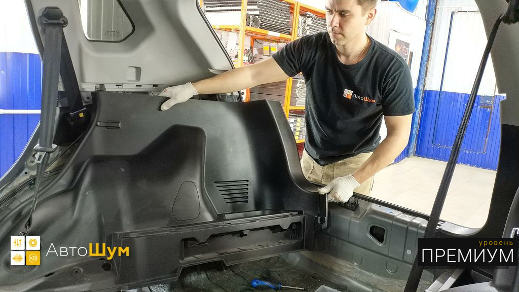 Разбираем багажник, все детали складываем на специальный стеллаж. Штатная шумоизоляция багажника практически отсутствует, при этом еще и плохо держится на кузове. Очищаем и обезжириваем, после приступаем к монтажу