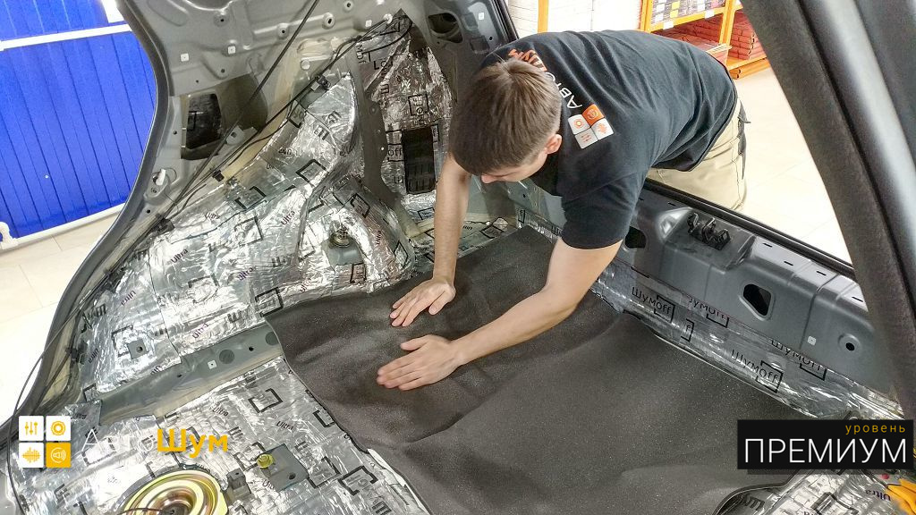 Обезжириваем поверхность и приступаем к монтажу второго слоя. Также для получения более эффективного результата используем компоновку из двух материалов На дно багажника клеим Шумофф Base 4. Этот слой позволит снизить нам шум от дороги.