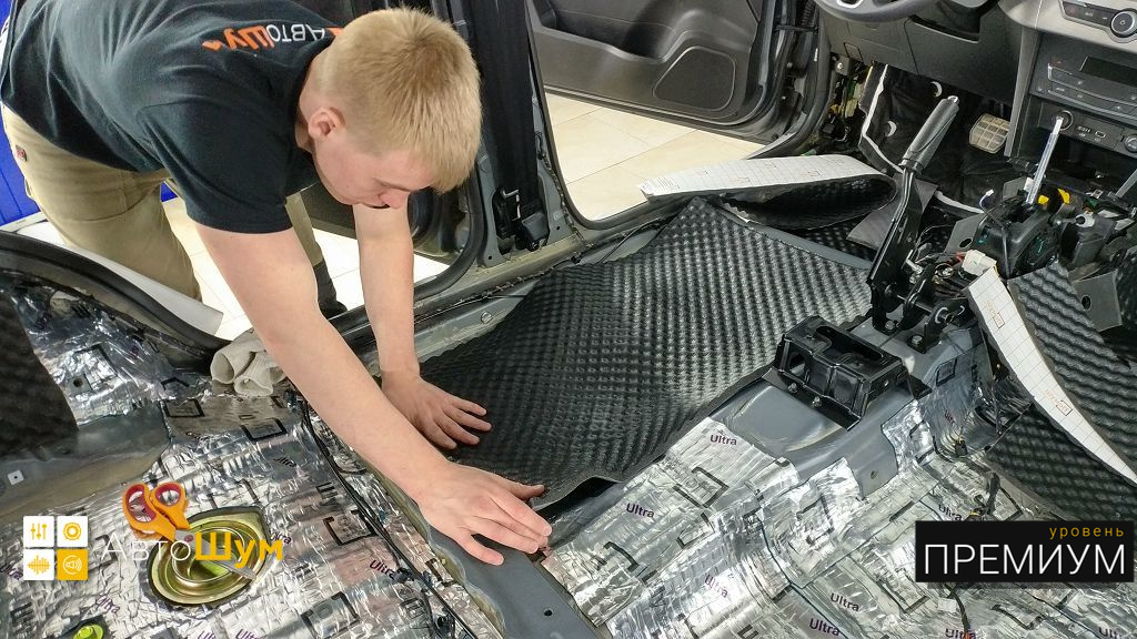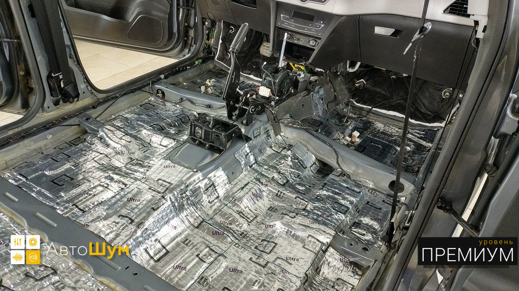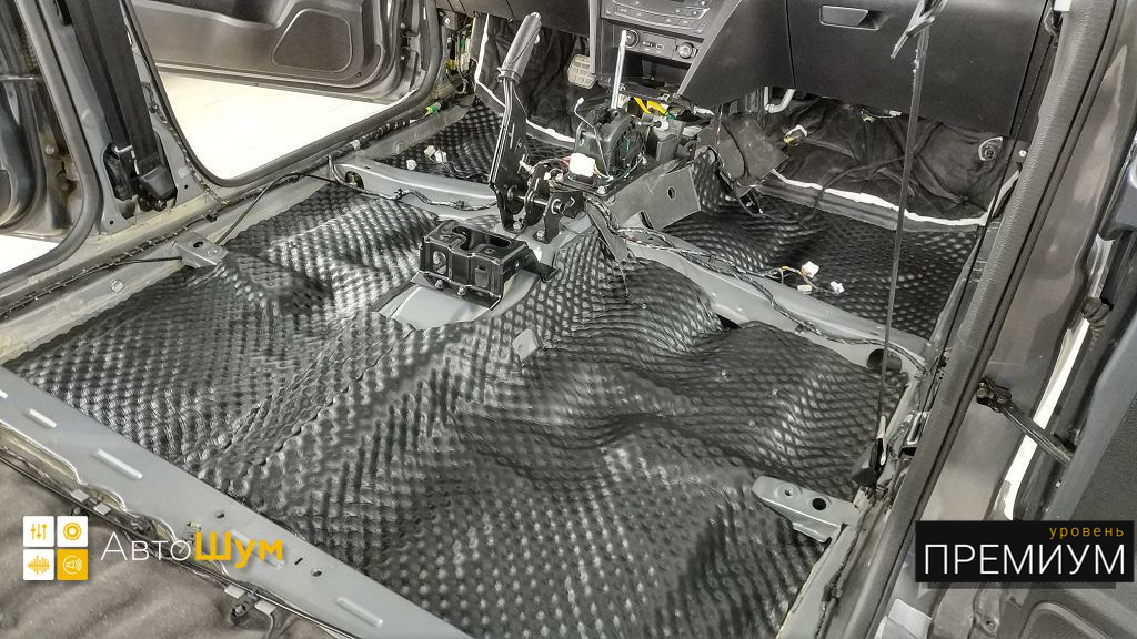 От моторной перегородки и до заднего сиденья вмести с ним клеится мощный многослойный шумо и звукоизолятор Шумофф Prizma 6.