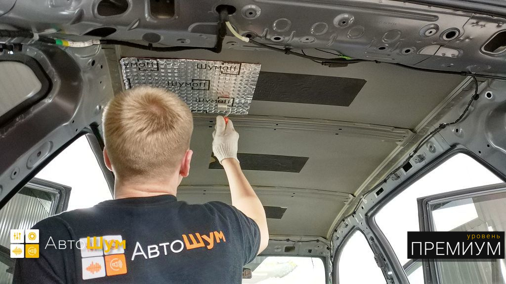 Вторым слоем поверх виброизоляции клеим на крышу современный и очень эффективный шумопоглотитель Шумофф Absorber А15.
