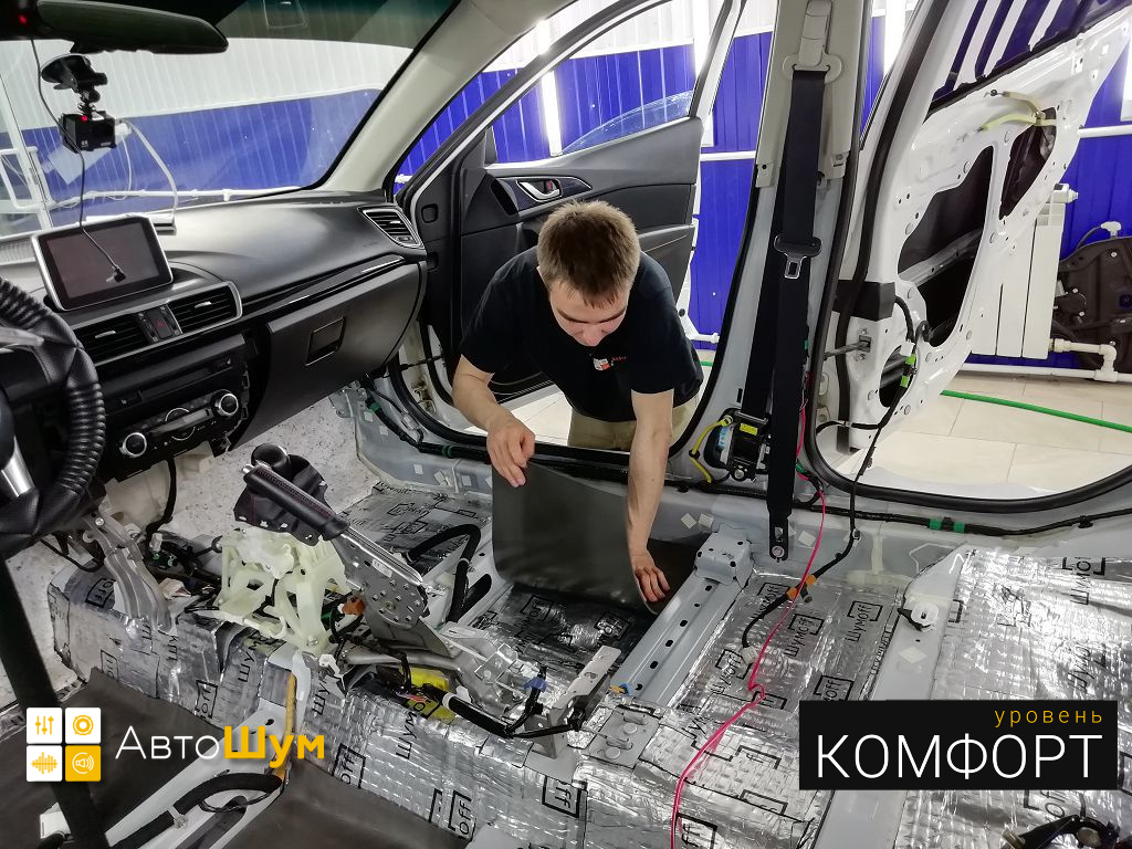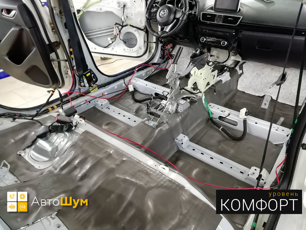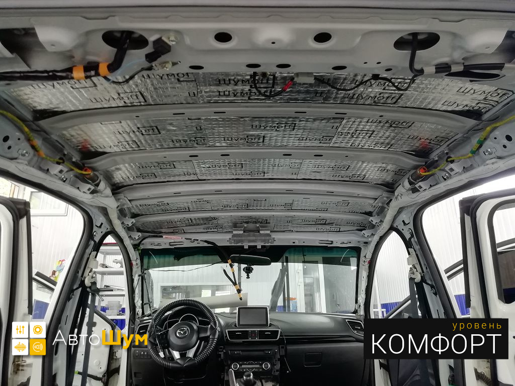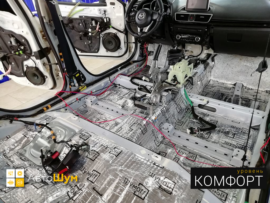 Автомобили Mazda последних поколений отличаются очень слабой шумоизоляцией, а в сочетании с тонким металлом сводят её на нет. Владелец сетовал на шум со стороны дорожного покрытия, арок, дверей. Исправить эти недостатки можно, сделав дополнительную шумоизоляцию Мазды 3.
