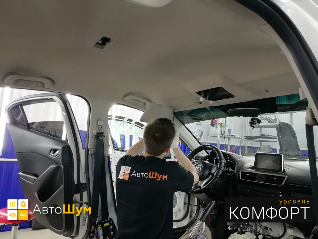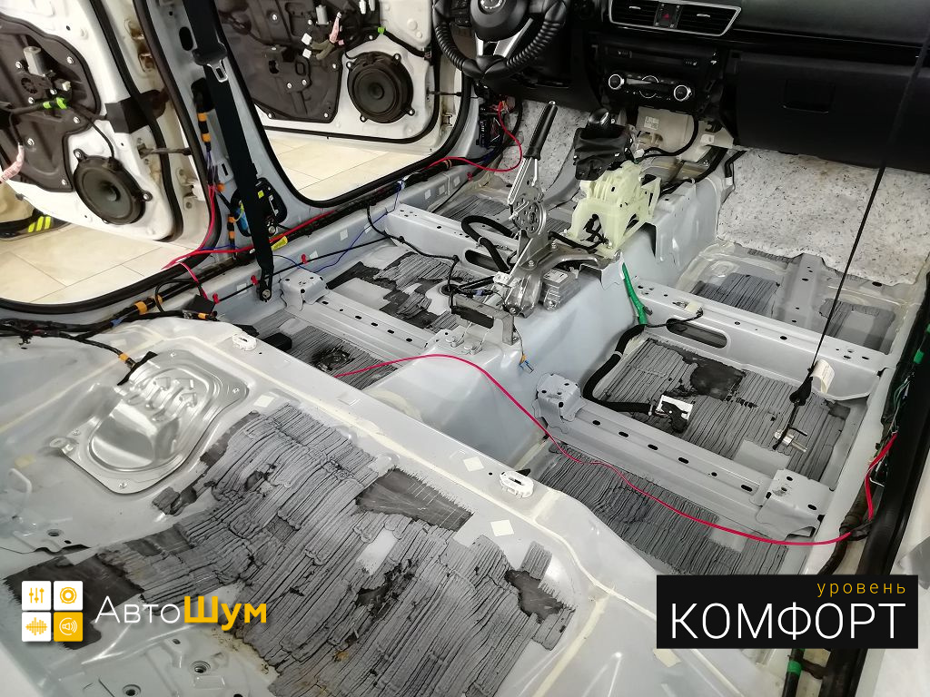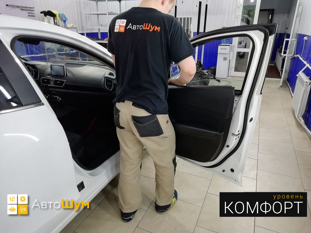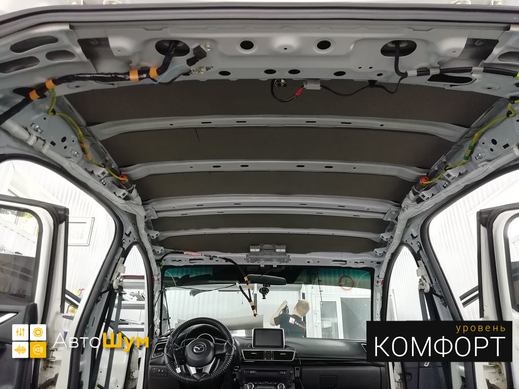 Автомобили Mazda последних поколений отличаются очень слабой шумоизоляцией, а в сочетании с тонким металлом сводят её на нет. Владелец сетовал на шум со стороны дорожного покрытия, арок, дверей. Исправить эти недостатки можно, сделав дополнительную шумоизоляцию Мазды 3.