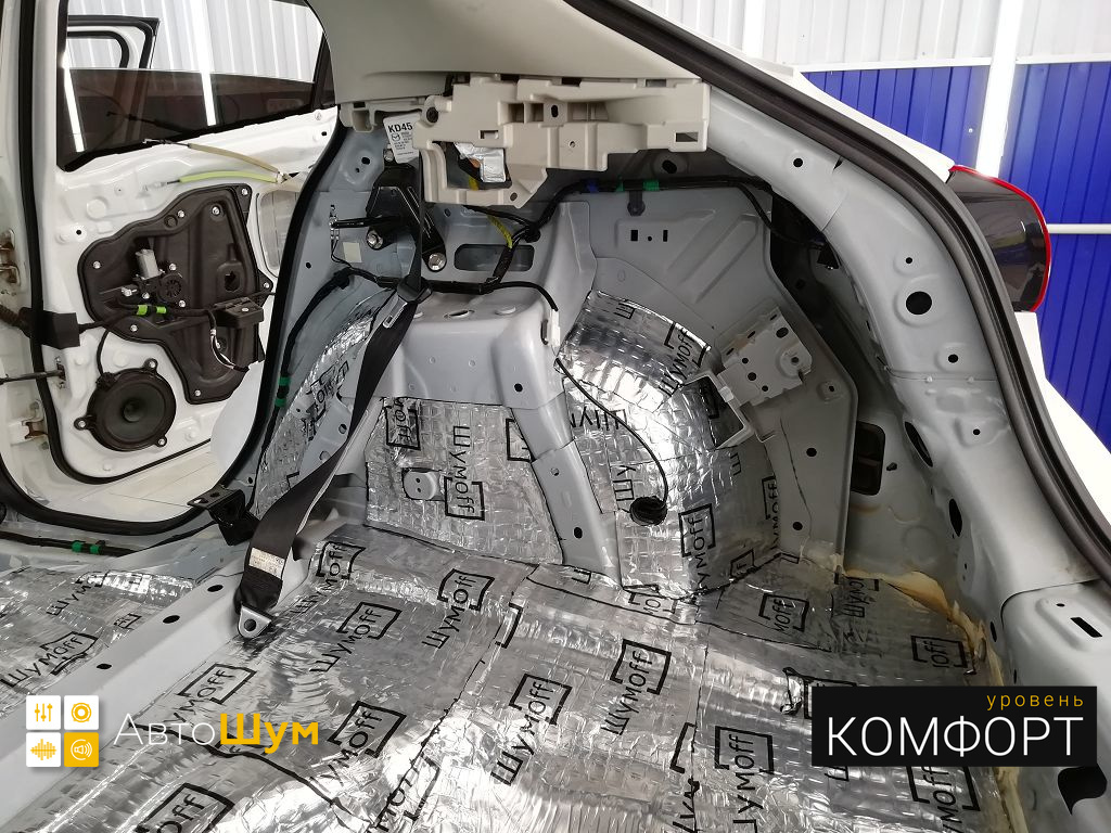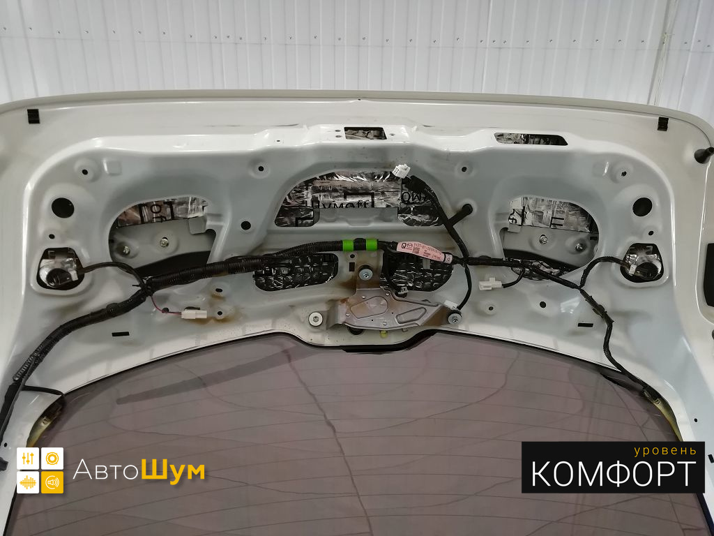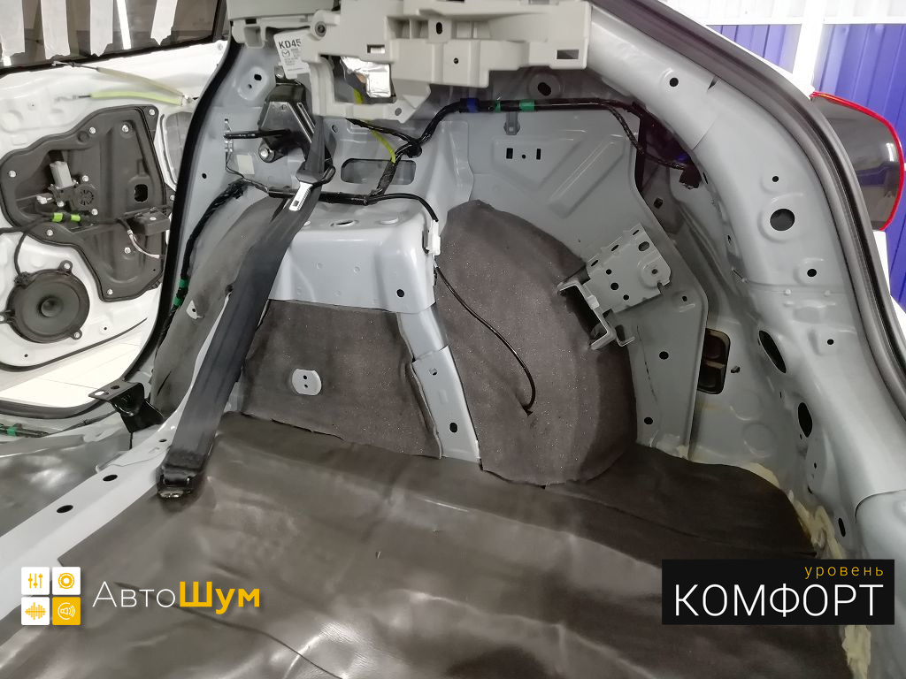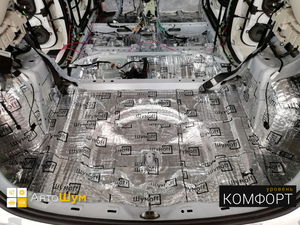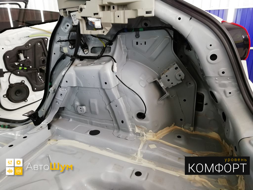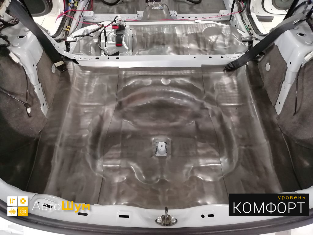 Дно багажника и крылья оклеиваются шумо и теплоизолятором Шумофф П4 4. Арки оклеиваются шумопоглотителем Flex A15.