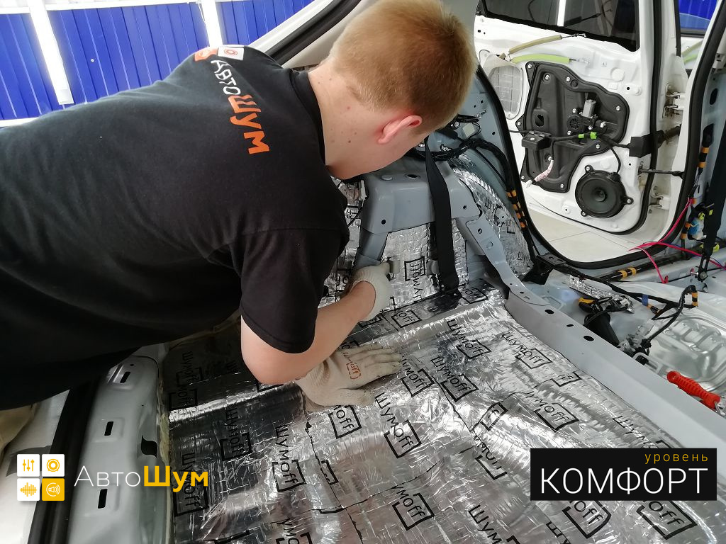 Переходим к нанесению второго слоя. На пол до задних сидений наносим толстый шумо и теплоизолятор на основе вспененной резины Шумофф Комфорт 6. Под заднее сиденье монтируем шумопоглотитель Шумофф Герметон 7. На арки же наносится шумопоглотитель Absorber А15.