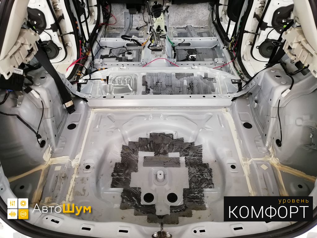 От моторной перегородки и до заднего сиденья вмести с ним клеится мощный многослойный шумо и звукоизолятор Шумофф Prizma 6.