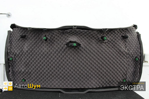 Монтируем шумопоглотитель на капот авто Вторым слоем, но уже на обшивку капота наносим шумопоглотитель Шумофф Absorber A15. Данная компоновка позволит нам не просто снизить шум от двигателя, но и увеличить теплоизоляцию подкапотного пространства, от чего двигатель будет быстрее прогревается и медленнее остывать зимой.