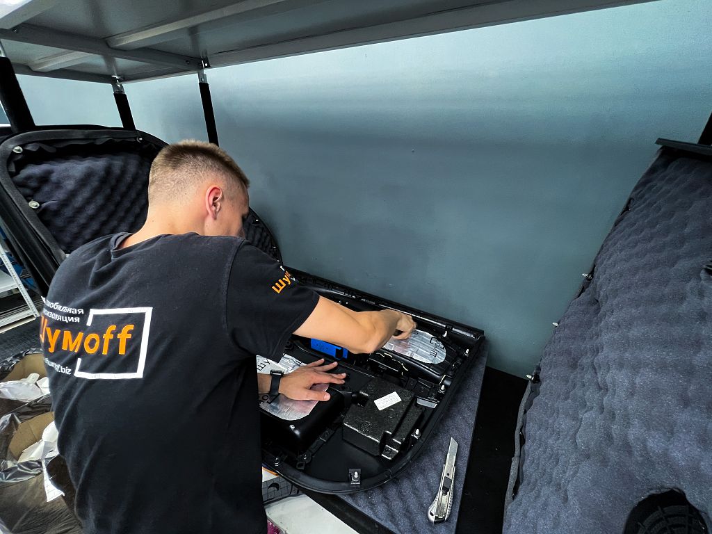 Приступаем к монтажу виброизоляции. Первым слоем на металл арки наносим толстую и эффективную виброизоляцию Шумофф М4. Перед нанесением, для более сильной адгезии материал прогревается в специальной печи