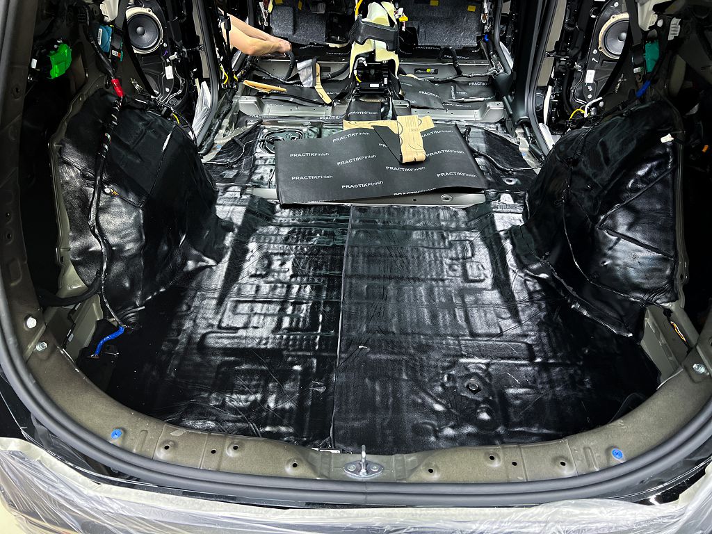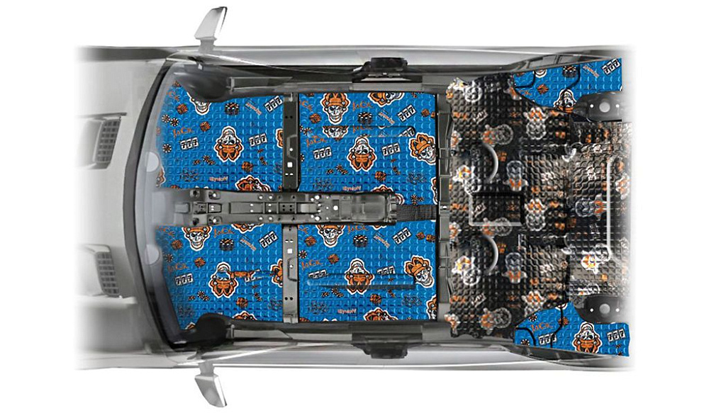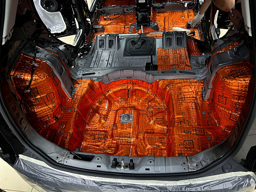 Дно багажника и крылья оклеиваются шумо и теплоизолятором Шумофф П4 4. Арки оклеиваются шумопоглотителем Flex A15.