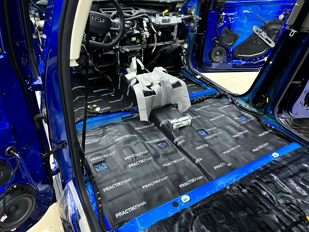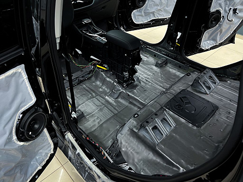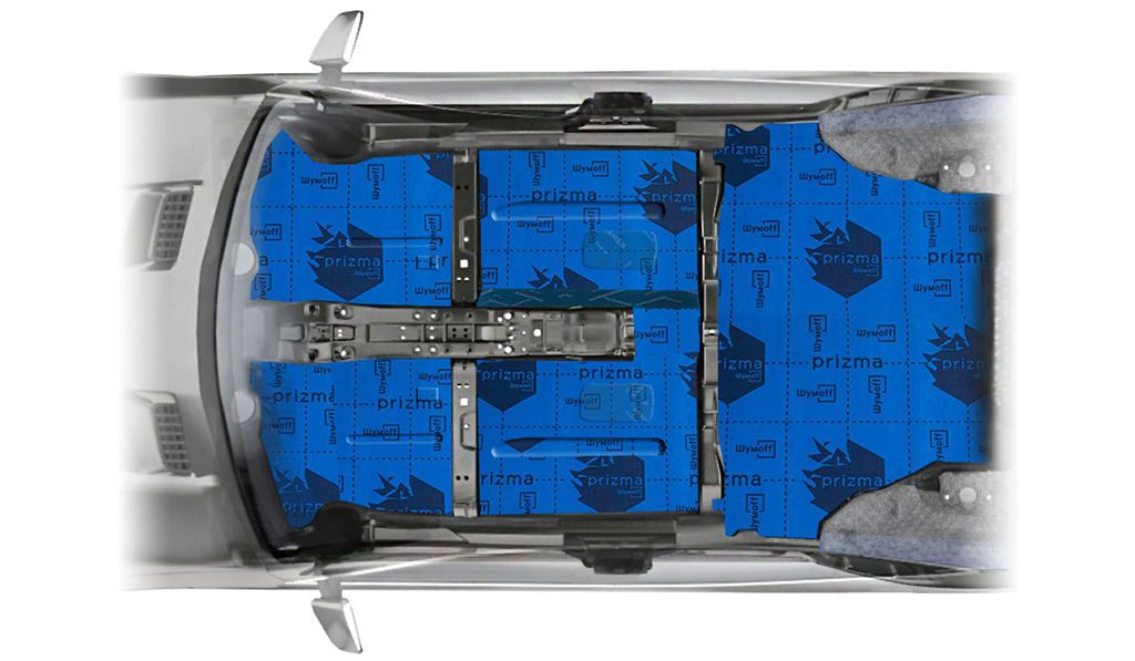 От моторной перегородки и до заднего сиденья вмести с ним клеится мощный многослойный шумо и звукоизолятор Шумофф Prizma 6.