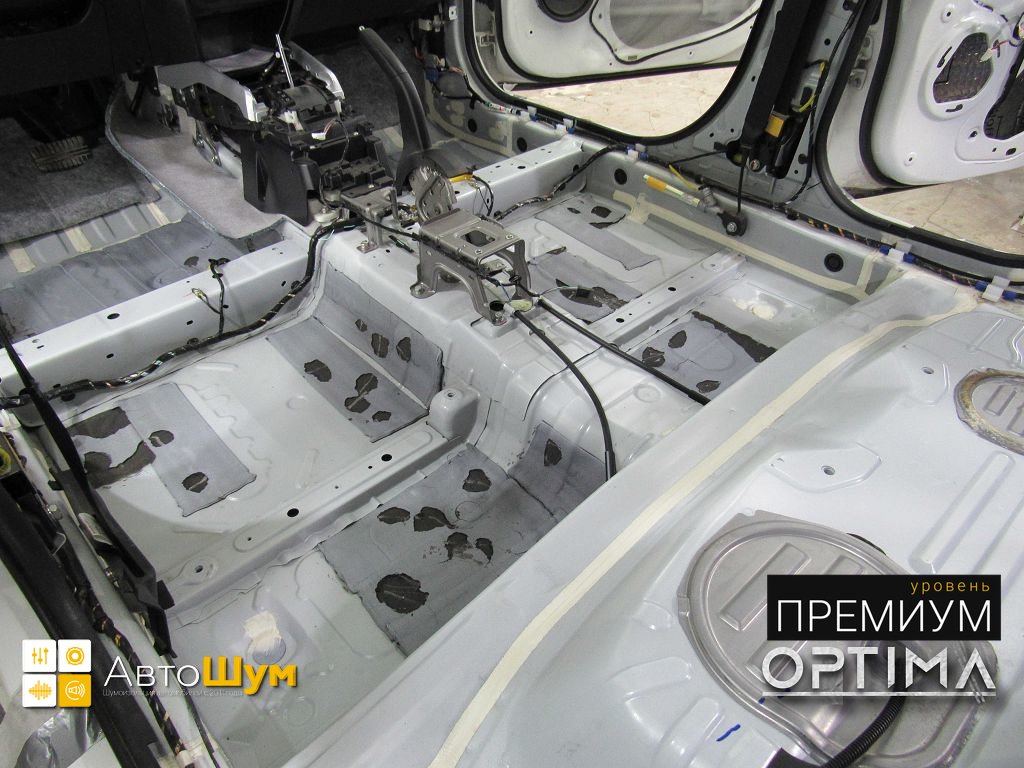 От моторной перегородки и до заднего сиденья вмести с ним клеится мощный многослойный шумо и звукоизолятор Шумофф Prizma 6.