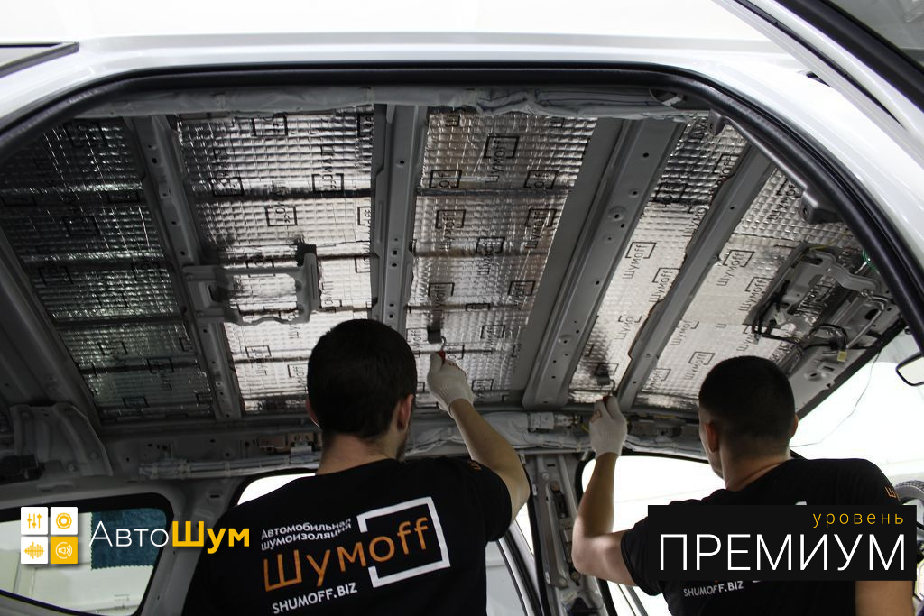 Вторым слоем поверх виброизоляции клеим на крышу современный и очень эффективный шумопоглотитель Шумофф Absorber А15.