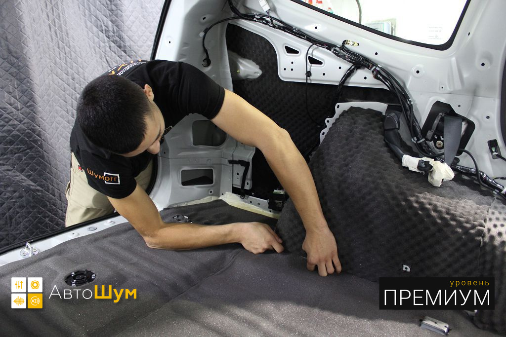Дно багажника и крылья оклеиваются шумо и теплоизолятором Шумофф П4 4. Арки оклеиваются шумопоглотителем Flex A15.