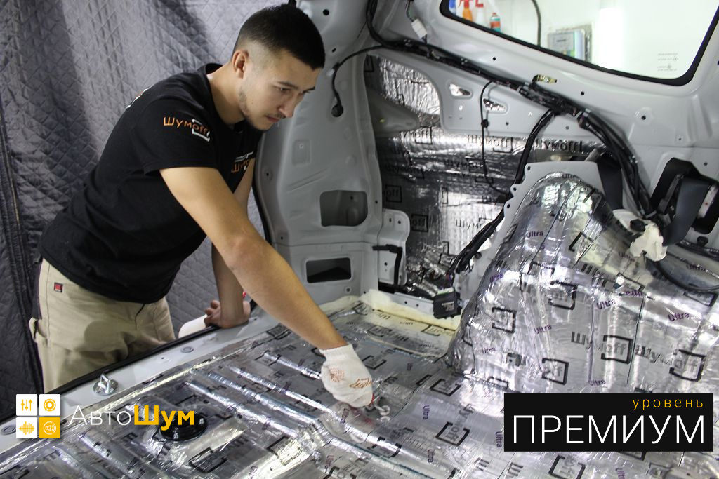 Обезжириваем поверхность и приступаем к монтажу второго слоя. Также для получения более эффективного результата используем компоновку из двух материалов На дно багажника клеим Шумофф Base 4. Этот слой позволит снизить нам шум от дороги.