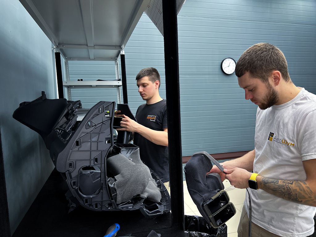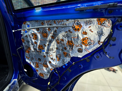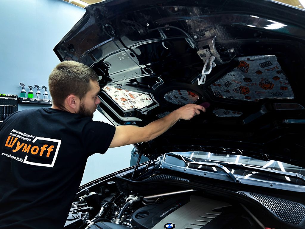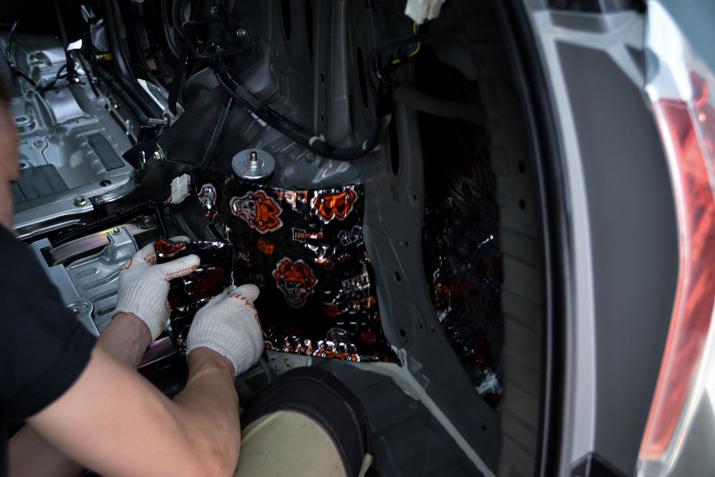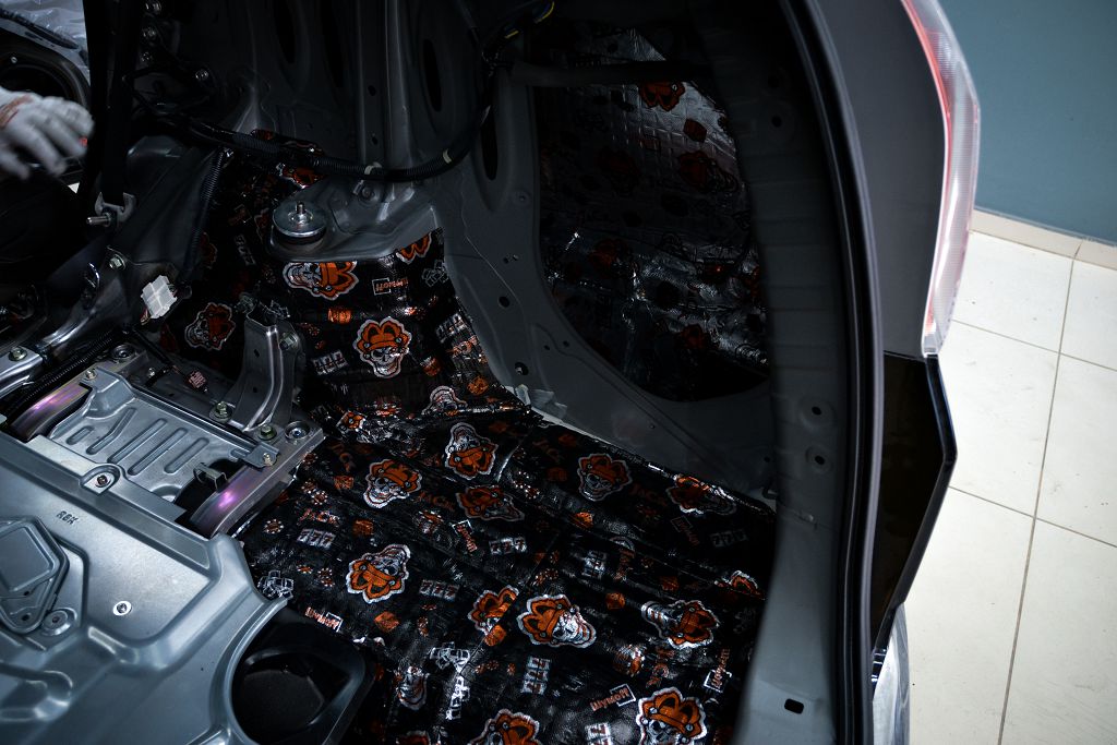 Дно оклеивается многослойным шумо и звукоизолятором Шумофф Prizma 6, крылья, арки и крышка багажника шумопоглотителем Absorber A15.