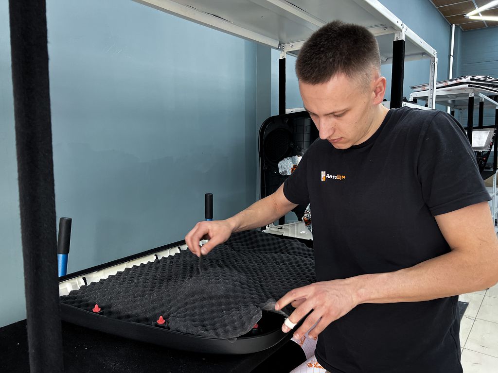 Внутренняя поверхность обивки оклеивается шумопоглотителем Шумофф Flex А15.