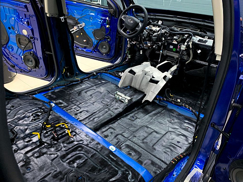 От моторной перегородки и до заднего сиденья вмести с ним клеится мощный многослойный шумо и звукоизолятор Шумофф Prizma 6.