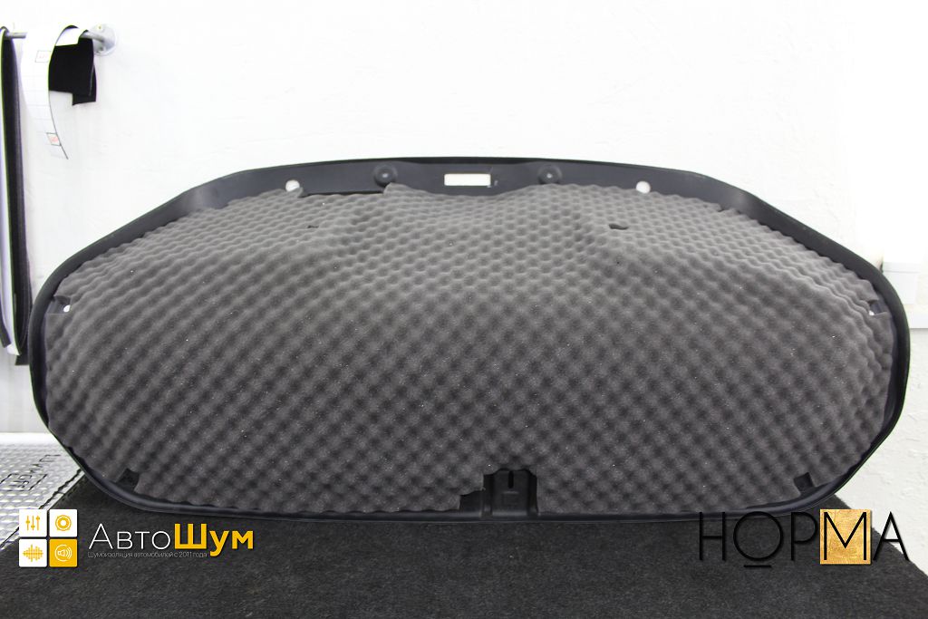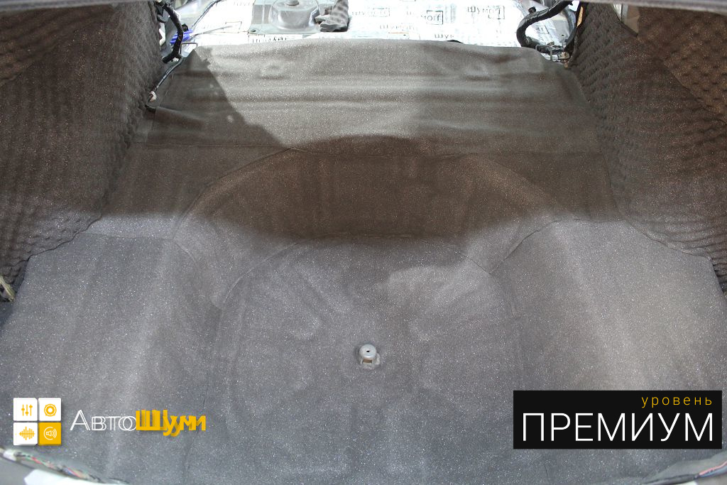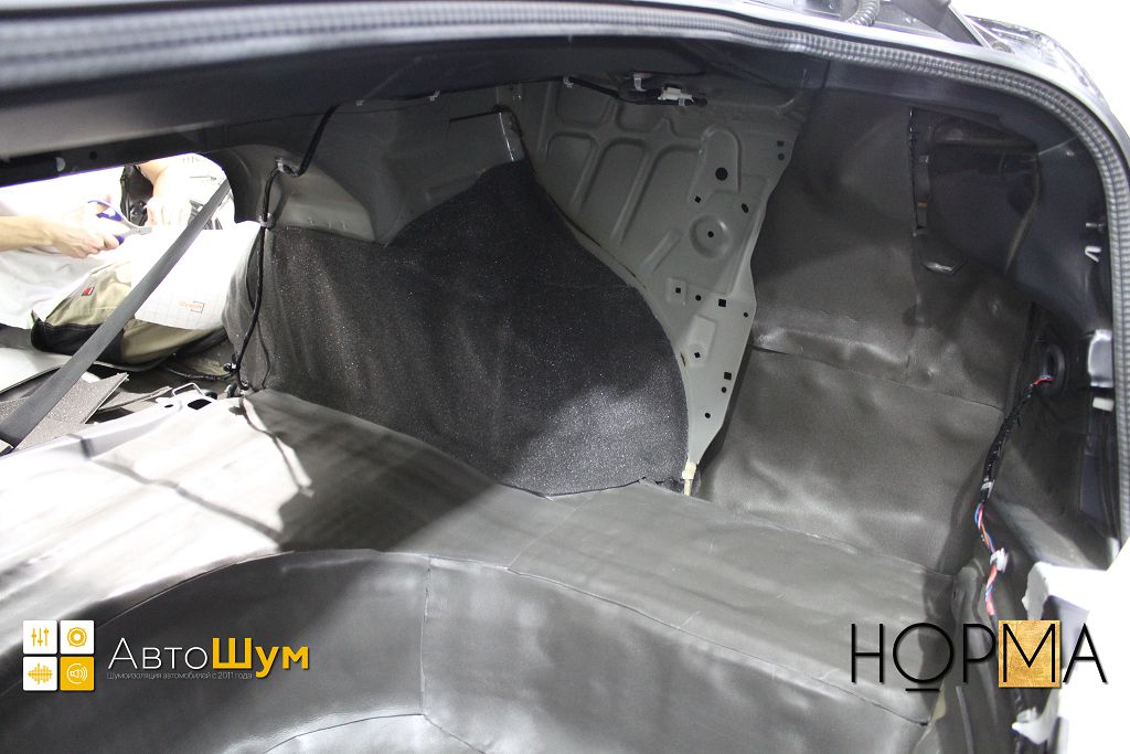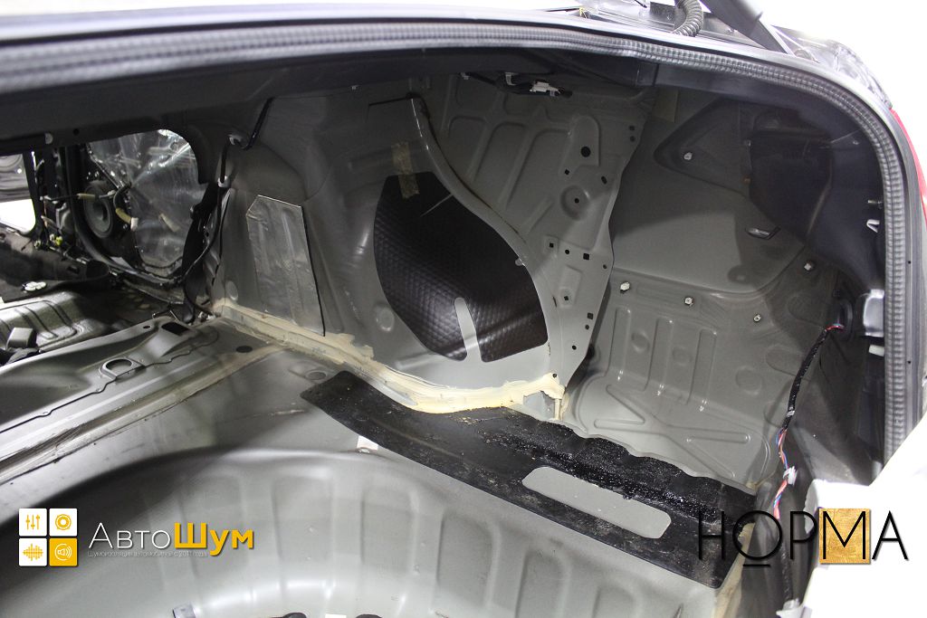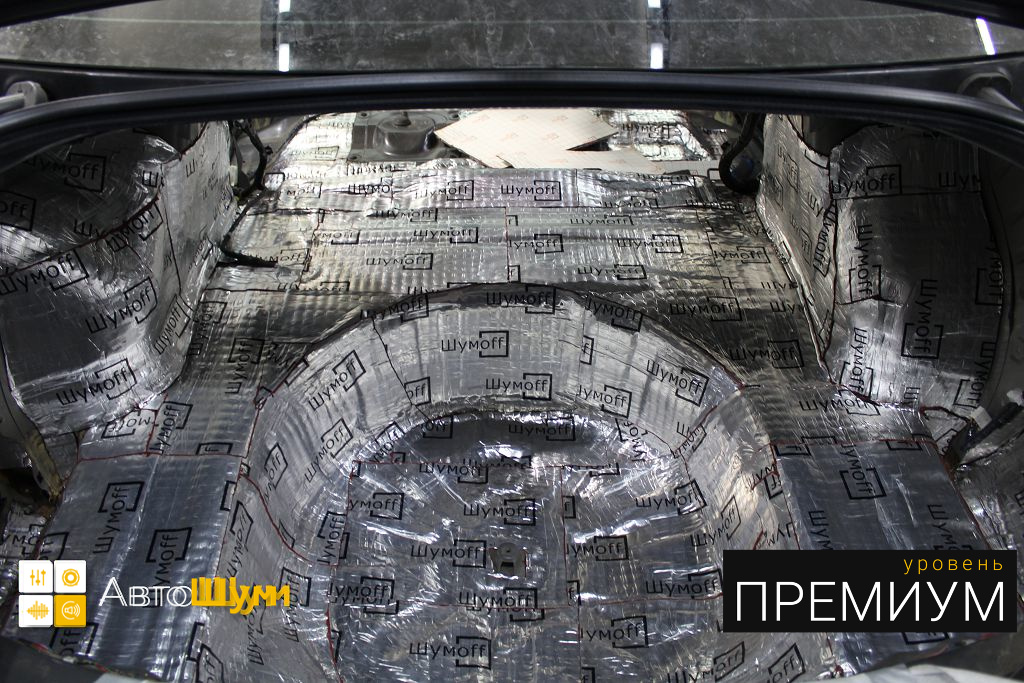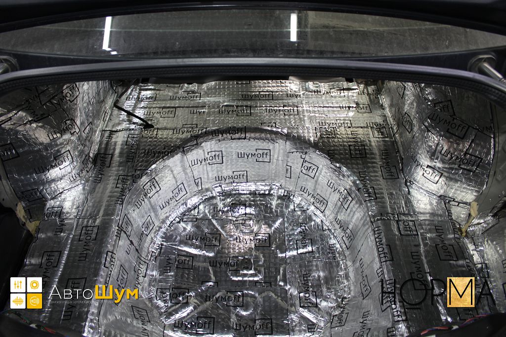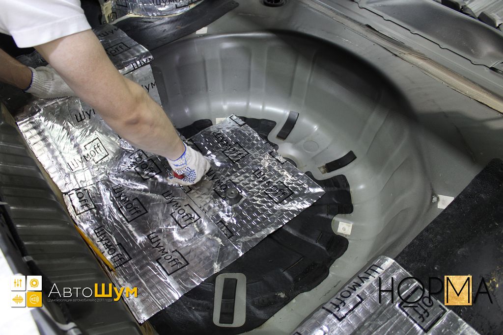 Дно багажника и крылья оклеиваются шумо и теплоизолятором Шумофф П4 4. Арки оклеиваются шумопоглотителем Flex A15.