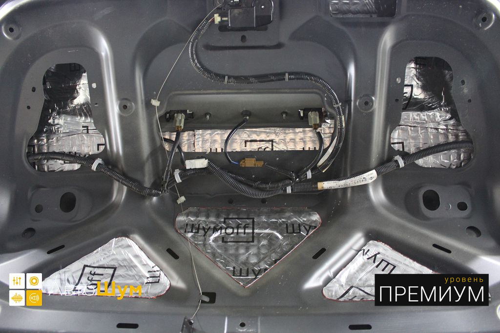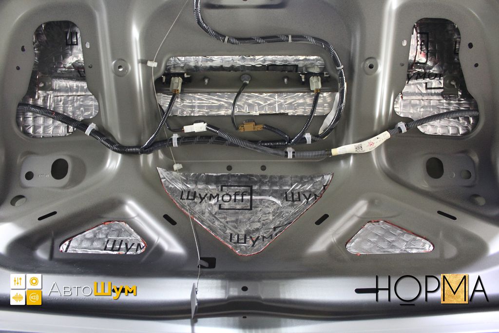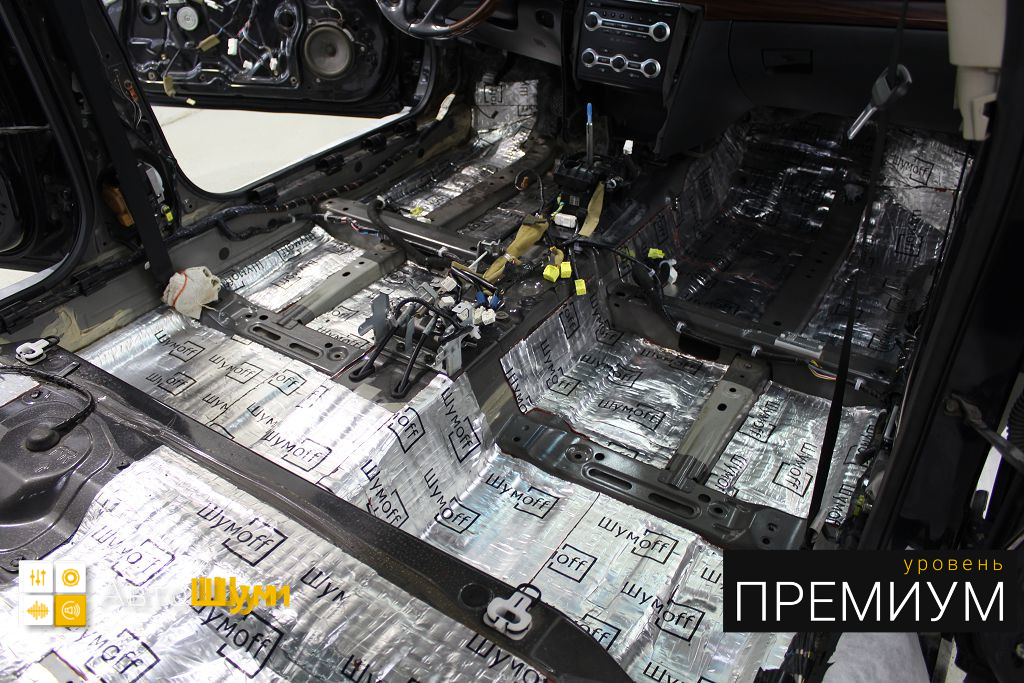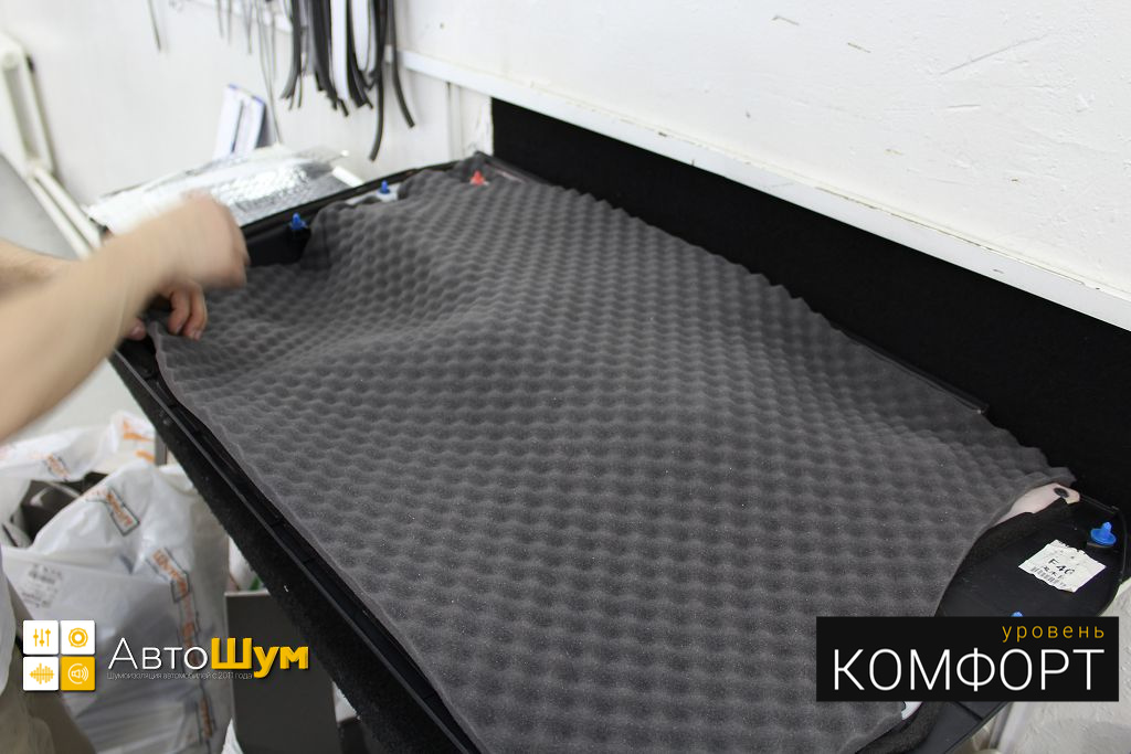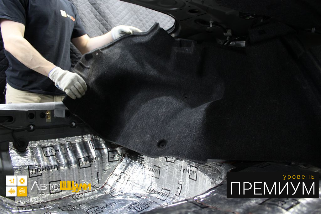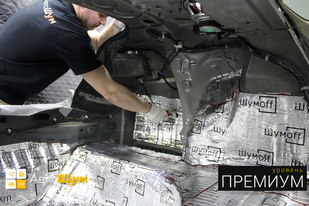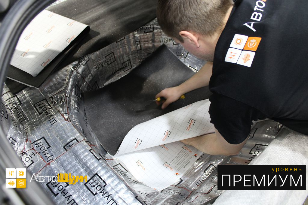 Дно оклеивается многослойным шумо и звукоизолятором Шумофф Prizma 6, крылья, арки и крышка багажника шумопоглотителем Absorber A15.