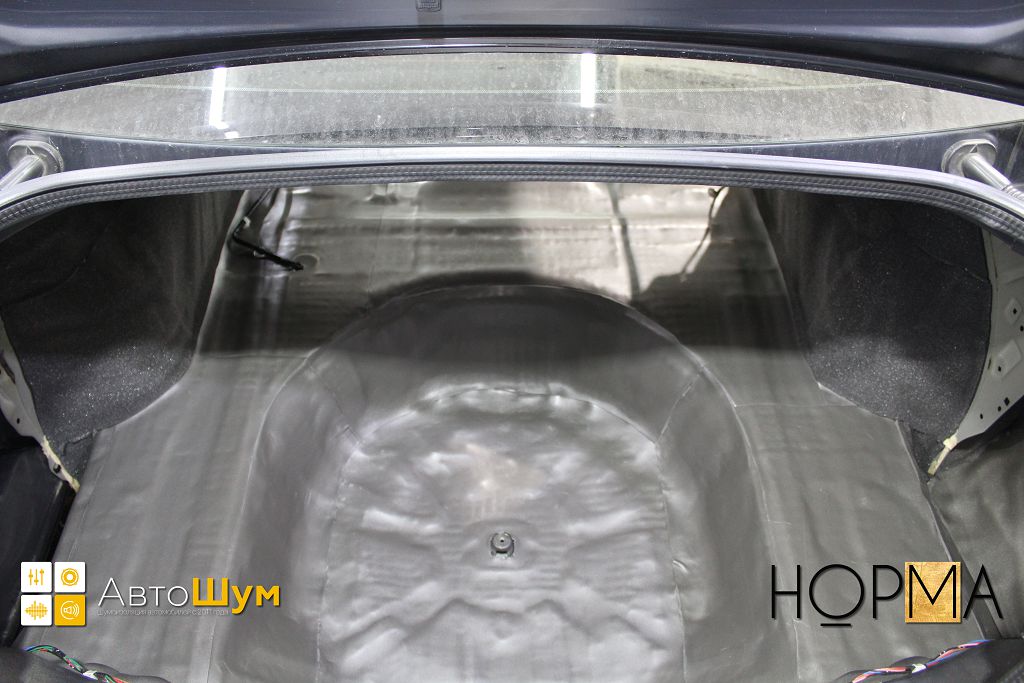 Первым слоем на дно багажника клеим виброизоляцию толщиной 3мм Шумофф М3.